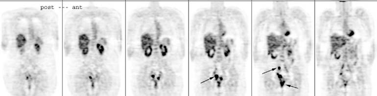 Ovarian cancer is staged surgically. Localization of tumor deposits prior to surgery is helpful in respect to detailed planning of the operation. The most common forms of spread of ovarian cancer are peritoneal and lymphogenic. Using FDG-PET, Schroder and colleagues7 have imaged 30 patients with ovarian cancer who were staged with laparatomy. FDG-PET showed a sensitivity of 71% in diagnosis of peritoneal involvement and 73% for diagnosis of pelvic lymph node metastasis.7 Ovarian cancer has a high recurrence rate even after primary chemotherapy in early-stage tumors. Recurrent tumors are usually sensitive to chemotherapy if they responded initially and recurrence has not occurred before 6 months after initial chemotherapy. However, a second cytoreductive surgery may prolong survival in patients with resectable tumors. Nakamoto and colleagues9 have compared PET and conventional imaging in 24 patients with suspected recurrence of ovarian cancer after initial surgery and chemoradiotherapy. The accuracy of PET imaging for recurrence was 79.2%, which was not significantly different from 73.3% obtained for conventional imaging that included CT and/or MRI. The accuracy however was significantly improved to 94.4% when PET was combined with conventional imaging. PET provided additional information in 42% of patients, which resulted in change of management in 33% of the patient group. The FDG PET scan of a patient with recurrent ovarian cancer is presented in Figure 2. In conclusion, FDG-PET imaging appears to be a new promising tool for diagnosis of recurrent and metastatic disease in ovarian and cervical cancers. It has a good accuracy for detection of pelvic and para-aortic nodal disease in cervical cancer and appears superior to conventional imaging modalities. At this time, FDG-PET cannot be recommended for screening of asymptomatic ovarian masses because of its low sensitivity for small and borderline tumors. Although FDG-PET appears to be a particularly useful tool in recurrent ovarian cancer to evaluate for metastatic disease, especially when combined with conventional imaging, it cannot exclude the presence of peritoneal and pelvic nodal disease and therefore cannot replace initial staging or second-look surgery. |