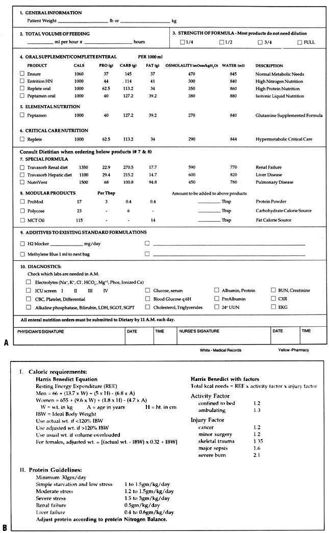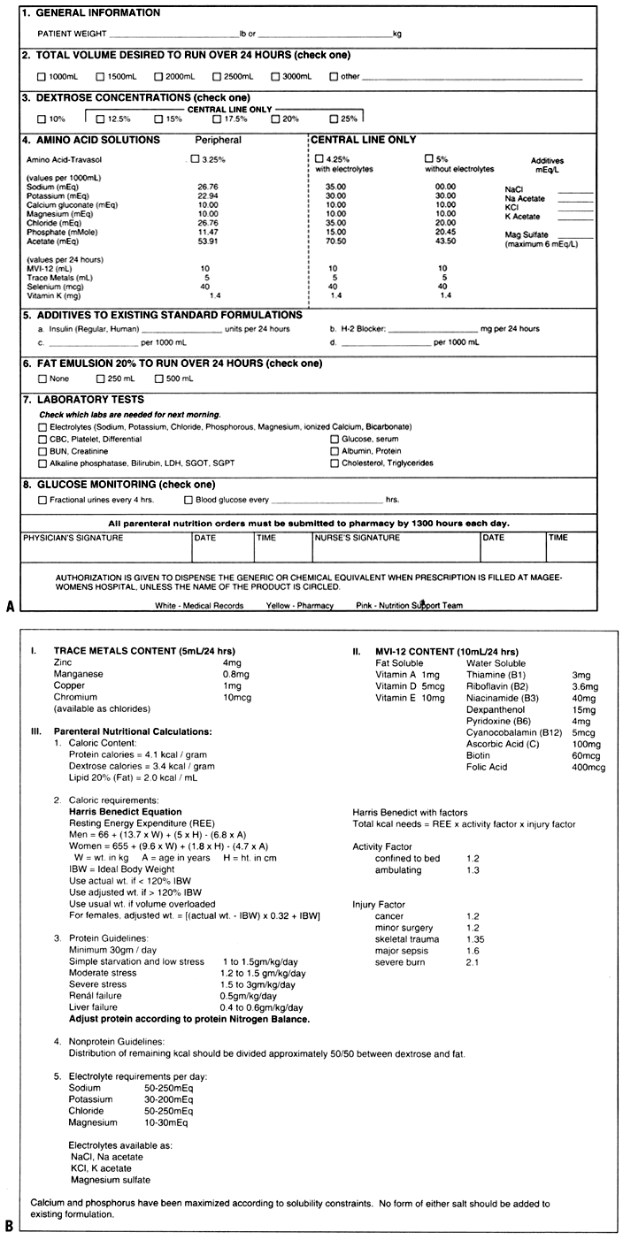 A careful account of nutritional requirements is a prerequisite for producing any artificial nutritional formula. This is true whether the support is to be administered by enteral or parenteral route. An important preliminary point is to establish clinical endpoints, which should be used to determine when enteral feeding, PPN, or TPN should be stopped. As has already been emphasized, this therapy should not be administered in the cancer patient without understanding that it carries with it substantial risks as well as benefits. It is a source of frustration to the nutrition-care team and is certainly not in the patient's interest for a complication to arise from a therapy that is no longer indicated, and but for a lack of forethought should have already been stopped. This is especially important to keep in mind when administering TPN for an uncertain period of time in a patient in whom lean body mass is compromised due to progression of disease. Appropriate clinical endpoints for cessation of artificial nutrition should always include resumption of oral/enteral intake that is adequate for absorption of energy and protein. Patients whose condition has improved to the point where oral nutrition can resume are the most likely to benefit from a short course of support. In a setting where nitrogen excretion can be measured, maintenance of positive nitrogen balance is a good clinical endpoint. If a patient is taking in more nitrogen than she excretes in urine, feces, skin, and exhaled air, one can assume the nitrogen is being “fixed” in new protein. If this patient can maintain nitrogen balance without the nutritional intervention, as determined by clinical and laboratory indices, it should be stopped. It must be emphasized that a particular patient's nutritional requirements will be the same regardless of the route of absorption. In order to heal, all patients need energy-producing molecules, essential nutrients for anabolism and body processes, water, and electrolytes. Providing these ingredients in the proper quantities and proportions is the goal of a successful nutritional prescription. Some patients have specific problems that make fulfilling their nutritional requirements more challenging. Patients with large burns or wounds, complex enteric fistulas, and renal or hepatic failure require a different protein composition and perhaps vitamins and trace metals added to their formulas. Patients on respirators and those with chronic obstructive pulmonary disease need to have special attention paid to endogenous production of respiratory CO2. This can be adjusted by changing the proportion of energy derived from glucose, which is metabolized to CO2. The oncologist would be well advised to consult with critical-care and nutrition specialists when devising a formulation for patients with new or preexisting major organ-system insufficiency. Most hospitals use preprinted nutritional prescription forms for inpatient therapy. This practice allows nutrition pharmacists to standardize the preparation of enteral and parenteral solutions. Additives such as heparin and insulin are included on the forms, and the ordering physicians are reminded to include trace metals and vitamins on the appropriate schedule. These forms not only facilitate preparation of the patient's formula, but also provide guidance to clinicians about nutritional requirements. At Magee-Womens Hospital, formulas required for the calculation of nutritional requirements are provided on the back of the prescription form. These forms (see Fig. 1 and Fig. 2) are currently used in the pharmacy and on the gynecologic oncology unit. Energy Requirements Preparing the nutritional prescription begins with determining a daily energy requirement. The number of calories required to maintain homeostasis is provided in the form of proteins, carbohydrates, and lipids. Patients with cancer who require nutritional support have a wide range of activity levels, and therefore have widely disparate energy substrate requirements. To maintain lean body mass, energy as measured by calories must be provided for anabolism to proceed and for body processes to continue. Patients with weight loss due to inadequate ingestion of calories should have some assessment of their basal metabolic rate. As mentioned previously, there are several means for accomplishing this, depending on the degree of precision required. In patients with pulmonary artery catheters, this information can be derived from oxygen utilization in a formula that uses cardiac output and mixed venous and arterial oxygen saturation. A more common means of estimating nutritional requirements is the Harris-Benedict formula. A patient with a severe injury, however, must have her calorie requirement adjusted by the addition or another 50% to 100% over the value derived from the Harris-Benedict equation. Determination of standard energy requirements in gynecologic oncology is severely limited by a paucity of data in this population. For a patient with a significant metabolic burden attributable to a gynecologic malignancy, one can only assume an increase in energy requirements and make adjustments accordingly. A practical approach to energy delivery assumes that there is a given number of kilocalories required to maintain 1 kg of lean body mass in 1 day. This number is adjusted based on a clinical impression of the level of metabolic stress and on consideration of the patient's list of current problems. Patients who require nutritional support, but who have had minor procedures, small surgical wounds, and no significant confounding metabolic stress, are probably well served by 30 kcal/kg/day. This should be considered the average protein requirement for patients with primary malnutrition (i.e., nutritional support is indicated for malnutrition alone). For patients with secondary malnutrition, such as those with ongoing severe metabolic stresses related to surgical wounds, infections, cancer, or burns, a