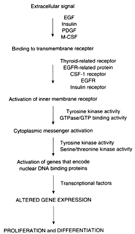 CSF = colony-stimulating factor; EGF = epidermal growth factor; FGF = fibroblast growth factor; GTP = guanosine triphosphate; GTPase = guanosine triphosphatase; PDGF = platelet-derived growth factor Tumor suppressor genes are a second major group of genes that regulate cell growth. These genes, which include the p53 gene and the retinoblastoma gene, encode DNA-binding proteins that normally act to inhibit cellular proliferation. Proto-oncogenes and tumor suppressor genes encode proteins that play important roles in every step of the intracellular signal transduction system and permit the cell to respond to external stimuli in a specific, coordinated, and controlled fashion (Fig. 1). The net result of the expression of proto-oncogenes and tumor suppressor genes is the regulation of cell growth and differentiation.