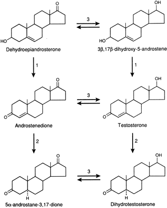 The conjugation of androgens to form sulfates or glucuronides occurs primarily at the C-17 and C-3 sites. Because conjugation is rapid, androgens leaving the liver in hepatic vein blood are conjugated primarily as glucuronides, but sulfates are also present. Because there is little cleavage of the glucuronide in tissues, the androgens formed in the liver do not contribute to the blood or tissue pool of unconjugated androgens.15 Androgen glucuronides do not bind to the androgen receptor and are, therefore, biologically inactive. There is some degree of sulfurylation of androgens that occurs in the liver, and the androgen sulfates, especially DHEAS, can be hydrolyzed in other tissues and contribute to the pool of active androgens. The extraction, or uptake, of androgens by the liver is high and close to 100% for those androgens not bound to SHBG. The binding to SHBG decreases the extraction, and only 40% to 60% of T and 30% to 40% of DHT are extracted by the liver.43,44 However, because of extensive metabolism in the intestinal wall and the liver, the oral administration of T or DHT is an inefficient way to increase overall androgenicity. Skin and Genital Structures As noted previously, the free hormone, which is inversely related to the SHBG concentration, is available for entering the cells of the target tissues.23 Recently, T was considered to be the male hormone. However, with advancement of the knowledge of cellular biology, particularly the intracellular events associated with biologic responses to androgen, it was evident that in many androgen-responsive tissues, DHT rather than T mediated the intracellular molecular events associated with responses to androgens.8 As noted previously, because of different binding affinities, DHT is a stronger androgen than is T.5 In tissues with relatively high levels of 5α-reductase, such as the hair follicle and sebaceous gland, the amount of DHT formed from precursors is relatively large and androgenic events are mediated by DHT rather than T. Thus, DHT is responsible for the male differentiation of the prostate and external genitalia, but virilization of the wolffian ducts is due to T.5,45 The levels of 5α-reductase are low in muscle;therefore, muscle development is under T control.8 The concept that steroids bind to and result in the nuclear translocation of a cytoplasmic receptor has altered in the past few years.46-48 It has been shown that estrogen receptors exist almost entirely in the nucleus, irrespective of steroid binding, and that estradiol diffuses through the cell membranes and cytoplasm to bind to the receptor in the nucleus. It would appear that the same concept applies to the androgens.48 The receptor is present in the nucleus but not bound to DNA. When androgen binds to its receptor, the latter can then bind to DNA and initiate transcription.46,48 In tissues with high levels of 5α-reductase, when a precursor, DHEAS, DHEA, Δ4-A, or T enters the cell, conversion to DHT occurs through the pathways shown in Figure 1. DHT is the androgen that is primarily responsible for stimulating the androgenic activity. In tissues that have minimal 5α-reductase activity, the same precursors are converted only to T, and it is that steroid that stimulates the androgenic activity.49,50 In either case, the degree of androgenic expression is dependent on the amount of active steroid or precursor steroid in the circulation, the blood flow to the tissue, the extraction of steroid by the tissue, and the enzyme activities of the tissue. In vitro studies have documented that human skin has the capacity to metabolize androgens and is an androgen-responsive tissue.8 The skin from the genital area of the fetus at 12 to 22 weeks of age has a greater capacity than nongenital skin to convert T to DHT, and the external genital skin of male and female fetuses can transform T to DHT. Thus, 5α-reductase activity in the urogenital tubercle, fold, and swelling is acquired very early in embryogenesis in both male and female fetuses and is not, itself, androgen dependent.45 The production of T by the testes of the male fetus and the in situ conversion to DHT stimulate these structures to form the external male genitalia. In the absence of T production or conversion to DHT, female external genitalia develop. The 5α-reductase activity persists after birth in those structures derived from the urogenital tubercle, fold, and swelling in both sexes. The clitoris is, therefore, androgen responsive. Valuable knowledge concerning the role of androgen metabolism in sexual differentiation of the internal and external genitalia has been acquired from studies of the skin and genital structures in male pseudohermaphroditism.51,52 In testicular feminization (i.e., complete male pseudohermaphroditism), the intracellular androgen receptor is absent but Müllerian inhibiting factor is fully active. Consequently, both male internal and external genitalia fail to develop, male secondary sex characteristics are not acquired, and the phenotype is female. In the type 2 incomplete form of male pseudohermaphroditism, an autosomal-recessive disorder, there is deficiency of 5α-reductase activity, resulting in deficiency of DHT formation, despite normal T and Δ4-A production. As a consequence of the inadequate DHT formation, there is incomplete differentiation of the male external genitalia, although the internal male genitalia develop normally.53 These findings indicate that 5α-reductase activity and DHT are required for differentiation of the male external genitalia but not the male internal sexual structures. The increased secretion of T at puberty stimulates enlargement of the phallus and induces the male secondary sex characteristics, including an increase in muscle mass, but beard growth and acne are minimal, indicating that these events are DHT dependent. One of the most interesting aspects of androgen metabolism concerns the growth of body hair.54 Not all hair growth is androgen d