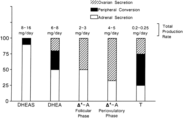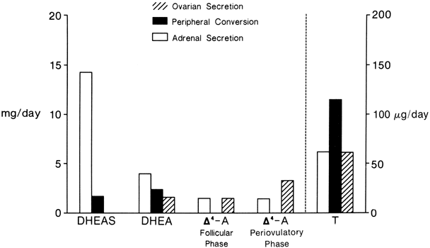 DHEAS, dehydroepiandrosterone sulfate; DHEA, dehydroepiandrosterone; Δ4-A, androstenedione; Δ5-A diol, androstenediol; T, testosterone; DHT, dihydrotestosterone. The main pathways of androgen metabolism and the required enzymes are depicted in Figure 1. The major sites that are involved in metabolism are the C-17, C-3, and C-5 positions of the steroid, and these are the same sites that determine androgenic activity.2 These pathways are present in the adrenals, ovaries, and peripheral tissues. The conversion of DHEA to Δ4-A or Δ5 - A-diol to T requires the 3β-hydroxy-Δ5 - steroid dehydrogenase enzyme systems (3β-HSD/KSI), which convert the unsaturated bond from the C-5,6 position to the C-4,5 position and oxidizes the 3β-hydroxy group to a 3-keto group. Recent studies have shown that there are a number of isoforms of this enzyme with tissue specificity. They belong to the family of short-chain dehydrogenase/reductase family.3 The interconversion of the 17-keto and the 17β-hydroxyl (OH) complex is accomplished by the 17β-hydroxysteroid dehydrogenase enzyme. There are at least five isoenzymes that are cell and substrate specific.4 Some of the isoenzymes convert 17-keto steroids to 17β-OH steroids in the ovary or testes. Because the 17β-OH group is essential for binding to the intracellular receptor protein, the addition of a hydrogen atom at C-17 significantly increases biologic potency. For example, the conversion of Δ4-A to T by this enzyme increases androgenicity some sevenfold to 10-fold. The introduction of a hydrogen atom in the alpha plane at C-5 of T through the action of the 5α—reductase increases the expression of androgenicity in most tissues since the dissociation rate of DHT is much less than that of T from the intracellular androgen receptor. Thus, even though it is present at a lower concentration, DHT will be bound to a greater extent than T.5 It should also be noted that the conversion of T to DHT is essentially unidirectional. Δ4-A and T can also be converted to 5β-androgens, by a 5β-reductase, but this is a less important pathway and probably is active only in splanchnic tissue in mammals but is more widespread and important in avian species.6 It should be noted that the 5β-reduced androgens can also be converted to 3α- or 3β-hydroxy compounds by the action of the appropriate 3-steroid dehydrogenase. Because of the configuration of the 5β-reduced compounds, they bind poorly to the receptor and have minimal activity. Through the action of 3α- or 3β-hydroxy steroid dehydrogenase, DHT is reversibly converted to 5α-androstane, 3α, 17β-diol or 5α-androstane-3β, 17β-diol. The 3α-hydroxysteroid is a member of the aldo-keto reductase superfamily (AKR), of which there are several isoforms.7 3α-diol has significant androgenic activity in certain tissues, but the activity of the 3β-diol is uncertain.8 The sources and amounts of the androgens produced daily are shown in Figures 2 and 3. DHEAS is almost exclusively adrenal in origin, but only 50% of DHEA is secreted by the adrenals.1 DHEAS and DHEA plasma levels are age dependent, being low in early childhood and rising between 6 and 8 years of age to plateau in late puberty.9,10 Δ5-A-diol has androgenic activity, but because of its ability to bind to the estrogen receptor, it has estrogenic activities as well. However, other than being a precursor of testosterone, its biologic significance is uncertain. Its production rate has been reported as 1 mg/day in young women.11 Δ4-A is an important androgen in women because of its biopotentiality as a prehormone through its conversion to T or estrone (E)in peripheral tissues. Circulating Δ4-A arises about equally from the adrenal and ovary with only a small amount arising from precursor conversion in nonglandular tissue (see Figs. 2 and 3).1 There is a slight increase in the concentration of Δ4-A in midcycle. Plasma Δ4-A exhibits a diurnal change synchronous with cortisol, although the magnitude of the swing throughout the day is much less than that of cortisol or DHEA because of the significant ovarian source that does not exhibit a diurnal rhythm.12 In normal women, approximately 25% of circulating T is derived from the adrenals and 25% from the ovaries. The other 50% arises from the peripheral conversion of precursors, primarily Δ4-A, with a small amount from DHEA (see Figs. 2 and 3). It should be noted that although the liver contains abundant 17β-hydroxysteroid dehydrogenase, it is a source of minimal amounts of circulating T, for reasons discussed below. Neither the adrenal nor the ovary secretes DHT, and circulating DHT arises from the peripheral conversion of precursor steroids. In women, the major source of DHT is circulating Δ4-A, but T contributes a small amount.13,14 The liver is also not a source for circulating DHT.15 The adrenal secretion of DHEA and Δ4-A is under the control of adrenocorticotropic hormone (ACTH), but whether ACTH also stimulates the secretion of DHEAS is uncertain.1 Administered as a pulse or an infusion, ACTH causes a threefold rise in DHEA and a twofold to threefold increase in Δ4-A, but the increase in T is smaller and may be because of the peripheral conversion of the increased amounts of precursors. Prolactin receptors have been shown on adrenal cells, and women with hyperprolactinemia may have elevated androgen levels16; but it is not clear whether prolactin plays a role in normal adrenal androgen secretion. The marked increase in the secretion of DHEAS at puberty has raised the question about an additional adrenal androgen-stimulating hormone, since neither ACTH nor cortisol increases then. A pituitary polypeptide, different from ACTH and prolactin, has been suggested as stimulating adrenal androgen secretion,17 but whether such a polypeptide exists remains conjectural. The ovarian cellular elements that produce androgens include the stroma, theca, and corpus luteum cells.18 A and T are obligatory intermediat