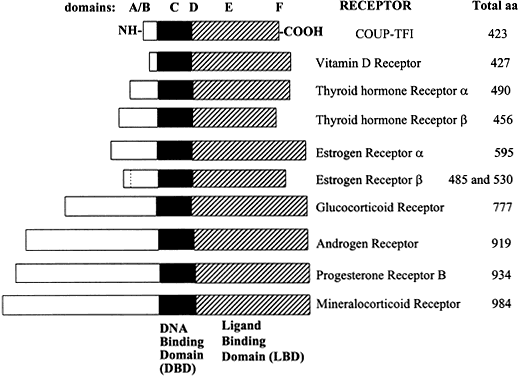Steroid hormones exert a wide variety of effects on growth, development, and differentiation, including important regulatory and behavioral functions within the reproductive system, central nervous system, and adrenal axis. These hormones act by binding to specific intracellular receptor proteins that function as signal transducers and transcription factors to modulate expression of target genes.1,2 Molecular cloning of the steroid hormone receptor genes in humans has been accomplished over the past 15 years (Table 1). Sequence comparison has revealed that steroid hormone receptors belong to a diverse family of ligand-activated gene regulators that share a highly conserved structure and common mechanisms affecting gene transcription.3 The evolutionary relationship among the steroid and nuclear receptors has been deduced by the high conservation in their DNA-binding domains (DBDs) and in their less-conserved ligand-binding domains (LBDs) and indicates that this large group of proteins arose from a common ancestral molecule.3 TABLE 1. Members of the Steroid Hormone and Nuclear Receptor Gene Superfamily