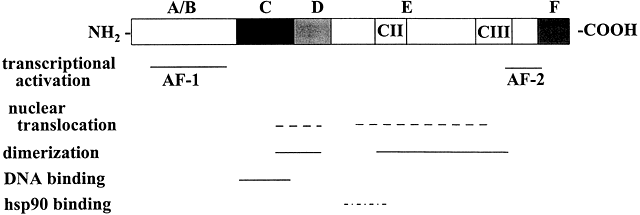 Arrival and Entry of Steroid Hormones Into Target Tissue Cells Steroid hormones are small, hydrophobic, and lipid-soluble molecules derived from cholesterol. They circulate in blood free or bound (95%) to plasma carrier proteins.56,57,58 Sex hormone-binding globulin (SHBG), also known as testosterone-estradiol-binding globulin (TeBG), and androgen-binding protein (ABP) are encoded by the same gene.59 ABP is produced by the Sertoli cells of the testis, and SHBG is produced by the liver and is present in the circulatory system.58 SHBG binds most gonadal steroids, and corticosteroid-binding globulin (CBG or transcortin) binds glucocorticoids and progesterone with different affinities. When circulating levels of steroid hormones exceed the binding capacity of their respective binding proteins, they can then bind nonspecifically and with low affinity to albumin, from which they can readily dissociate and enter target cells.60 The unbound and loosely albumin-bound steroids are believed to be the most biologically important fractions because the steroid is free to diffuse or be actively transported through the capillary wall and lipid plasma membrane bilayer. Extracellular binding proteins may modulate hormone response by regulating the amount of steroid available to the cell.60 The binding capacity of binding globulins is influenced by endocrine status and other factors.57 SHBG binds to a specific cell membrane receptor called sex hormone-binding globulin receptor (SHBG-R) and activates adenylyl cyclase, increasing intracellular cAMP.58 Binding of SHBG to SHBG-R also transfers SHBG into the cell as a consequence of receptor-mediated endocytosis.61 The interaction of SHBG with SHBG-R is inhibited when steroids are bound to SHBG, suggesting that SHBG is an allosteric protein.61 However, if unliganded SHBG is allowed to bind to its receptor on intact cells and an appropriate steroid hormone then is introduced, adenylate cyclase is activated and intracellular cAMP increases.62 After the steroid hormone is in the cytoplasm, it is not clear whether a transport protein is required for movement of the hydrophobic steroid molecule through the aqueous cytoplasm to the receptor, regardless of whether the receptor is cytoplasmic or nuclear in location. The currently accepted model is that the steroid hormone diffuses freely in the cytoplasm. Intracellular Localization of the Steroid/Nuclear Receptors Early attempts to isolate steroid hormone receptors led to a major controversy regarding their intracellular localization in the unliganded state. Reports published before 1984 suggested that, before hormone treatment, steroid receptors in target tissues were located predominantly in the cytosolic fraction as large protein complexes of 300 to 400 kd. After hormone exposure, receptors were detected primarily in the nuclear fraction.63 It was initially proposed that unoccupied and untransformed receptors were located in the cytoplasm until ligand binding, which caused their translocation into the nucleus. The reported presence of ERs and PRs in cytosol is now acknowledged to be largely artifactual, the result of homogenization and centrifugation processes used to isolate the receptor protein.64 The newly synthesized unliganded receptor is highly unstable and moves into the nucleus, targeted by its NLS, or associates with the HSP90 complex of cytoplasmic proteins.65 Although newly synthesized receptor proteins would be expected to contribute a small amount to cytoplasmic levels of receptor, most steroid/nuclear receptors in the unliganded state reside in the nucleus. The exceptions are the GRs and MRs, which in the unliganded state reside in the cytoplasm in a complex containing HSP90, HSP70, and a variety of receptor-associated proteins.66 HSP90 is a general molecular chaperone involved in the folding of various proteins. The HSP90 complex of proteins has chaperonin activity that facilitates hormone binding and subsequent proper folding of the GR.67 The HSP90 dimer is thought to stabilize the receptor, protecting it from protease degradation; block the DBD and the NLS; and maintain the receptor in an inactive state until ligand binding occurs (Fig. 5).68 HSP90 is also required for ligand binding by the steroid receptors.66 In addition to HSP90, unliganded steroid receptors extracted from animal tissues or mammalian cells showed that GRs and PRs are complexed with a number of other proteins, including HSP70, FKB59, p60, p48 (Hip), and p23.66,67 These proteins are thought to be required for the assembly and maintenance of ligand-sensitive aporeceptor complexes.