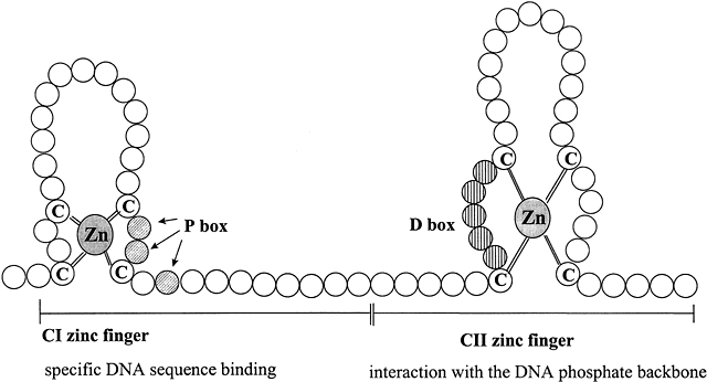 To understand how steroid hormone receptors regulate gene function, it is important to know the structure of the receptor proteins and the identity and cellular function of the genes that they regulate. Members of the steroid receptor superfamily share amino acid homology and a common structure (Fig. 1). Receptors in this superfamily contain several key structural elements that enable them to bind to their respective ligands with high affinity and specificity, recognize and bind to discrete response elements within the DNA sequence of target genes with high affinity and specificity, and regulate gene transcription.2 Molecular cloning of the complementary DNA (cDNA) for each of the major steroid receptors has greatly enhanced our understanding of the structure-function associations for these molecules. The receptor proteins have five or six domains designated A through F, from the N terminus to the C terminus, encoded by 8 to 9 exons. The receptors contain three major functional domains that have been shown experimentally to operate as independent "cassettes,"11 unrestricted according to position within the molecule. The three major functional domains (Fig. 2) of the receptor are a variable N terminus (domains A and B) that confers immunogenicity and modulates transcription in a gene and cell-specific manner through its N-terminal activation function-1 (AF-1); a central DBD (consisting of the C domain), composed of two functionally distinct zinc fingers through which the receptor physically interacts directly with the DNA helix; and the LBD (domains E and, in some receptors, F) that contains activation function-2 (AF-2). The F domain is thought to play a role in distinguishing estrogen agonists from antagonists, perhaps through interaction with cell-specific factors.12 Domain-swapping experiments in which the DBD of ERα was switched with that of the glucocorticoid receptor (GR) yielded a chimeric receptor that bound to specific DNA sequences bound by GR but upregulated of transcription of glucocorticoid-responsive target genes when treated with estrogen,13 demonstrating the specificity of the DBD in target gene regulation. The amino-terminal domain is hypervariable (<15% homology among steroid receptors) in size and amino acid sequence, is 25 to 603 amino acids long, and constitutes the major source of size differences between receptors.14 The AF-1 domain in this region is involved in activation of gene transcription but does not depend on ligand binding. In rat GR, the AF-1 region is called tau 1 or enh2 and constitutes amino acids 108 through 317. Deletion of the C-terminal LBD of GR yields constitutive (hormone-independent) transcriptional activation, implying that the N-terminal regions harbor autonomous transcriptional activation functions.15 Some steroid receptors exist as isoforms, encoded by the same gene but differing in their N terminus. The progesterone receptor (PR) and androgen receptor (AR) exist in two distinct forms, A and B, synthesized from the same mRNA by alternate splicing. The two PR receptor isoforms differ by 128 amino acids in the N-terminal region, yielding PR-A (90 kd) and PR-B (120 kd), which have strikingly different capacities to regulate transcription.16 In contrast, AR-A and AR-B isoforms show minimal differences in activation of a reporter gene in response to androgen agonists or antagonists in transiently transfected cells.17 The central core or DBD is highly conserved and shows 60% to 95% homology among steroid receptors.1 The DBD varies in size from 66 to 70 amino acids and is hydrophilic because of its high content of basic amino acids.11 The major function of this region is to bind to specific hormone response elements (HREs) of the target gene. DNA binding is achieved through the tetrahedral coordination of zinc by four cysteine residues in each of two extensions, which form two structurally distinct zinc fingers (Fig. 3).18 Zinc fingers are common among gene regulatory proteins.18 Specificity of HRE binding is determined by the more highly conserved hydrophilic first zinc finger (C1),14 and the second zinc finger (C2) is involved in dimerization and stabilizing DNA binding by ionic interactions with the phosphate backbone of the DNA.14 The D box is involved in HRE half-site spacing recognition. The highly conserved DBD shared by AR, GR, mineralocorticoid receptor (MR), and PR enables them to bind to the same HRE, called the glucocorticoid response element (GRE). The more C-terminal part of the C2 zinc finger and amino acids in the hinge region are involved in receptor dimerization in coordination with amino acids in the LBD.