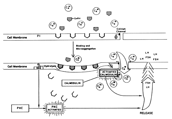 The sustained release of LH and FSH depends on the pulsatile stimulation of the gonadotroph by GnRH. For instance, within a narrow pulse range, increases in GnRH pulse frequency result in a reduction in gonadotropin secretion, regardless of the magnitude of the pulse (Fig. 4).32 This paradoxic effect is believed to result from a reduction (down-regulation) in the number of pituitary GnRH receptors.17, 33 At lower frequencies, however, a self-priming effect operates as well. Accordingly, the provision of GnRH heightens the pituitary response to a subsequent similar stimulus. In the ovariectomized and hypothalamus-pituitary disconnected ewe, a decrease in GnRH pulse frequency results in decreased LH pulse amplitude, secondary to a reduction in the amount of releasable LH.34 The frequency of GnRH pulses has a qualitative effect as well. For instance, in monkeys, changes in the frequency of GnRH pulses alters the FSH/LH ratio, whereas changes in the amplitude of the pulses have a minor effect.35 For example, the pulsatile administration (every 2 hours) of GnRH to hypogonadotropic men coincides with the release of LH and the α-subunit common to both gonadotropins, but not with the release of FSH. When GnRH is administered every 30 minutes, the release of α-subunits becomes erratic and baseline LH increases, although the coincidence with α-subunit pulses is lost. In addition, FSH decreases to barely detectable levels, resulting in an increased LH/FSH ratio.36 In contrast to the critical importance of the frequency of GnRH pulses, changes in the amplitude seem to have a lesser role.11 Nevertheless, in ovariectomized sheep, the pulse amplitudes of GnRH and LH are highly correlated.37 In women of reproductive age, a single bolus of exogenous GnRH elicits an acute release of LH and, to a lesser extent, of FSH. When GnRH is given at 2-hour intervals, a dose-response relationship exists between GnRH (from at least 10 mg and up to 300 mg doses) and LH.38 The response is detected 5 minutes after intravenous injection of GnRH and reaches its peak between 30 to 45 minutes later. In response to GnRH, the pituitary may release prolactin as well. Increased circulating prolactin following a 4-hour infusion of GnRH was first reported in a group of patients suffering from anorexia nervosa, who had gained weight during the week preceding the test.39 A similar effect was described in normal women, in whom the finding was more pronounced during the peri-ovulatory period.40 Because the prolactin increment following infusion of GnRH correlates with both the FSH response41 and with the LH response,42 the observed increase is believed to be the consequence of a paracrine interaction between gonadotropin and prolactin. However, elevations of prolactin in response to GnRH administration have been documented in 7 of 10 women during the midtrimester of gestation, despite the lack of gonadotropin response to GnRH. This nonspecific prolactin response could also have been explained by the positive effect of high circulating levels of estrogens during gestation on prolactin production and release, thus sensitizing the lactotroph to nonspecific stimuli.43 Moreover, GnRH sensitizes the lactotrophs to thyrotropin-releasing hormone action in normal women.44 Finally, GnRH may bind to somatotrophic and thyrotrophic cells as well, resulting in actions not yet clarified.15 Self-Priming Action of GnRH Gonadotropin-releasing hormone induces two separate phenomena in the pituitary. On the one hand, GnRH primes (sensitizes) the gonadotroph to subsequent stimulation by increasing the number of its own receptors (Fig. 5). A similar phenomenon of increased pituitary responsiveness to GnRH is involved in the maturation of the hypothalamic-hypophyseal axis during puberty,45 a phenomenon that is used to diagnose true precocious puberty. On the other hand, GnRH triggers the release of LH and FSH. Both the “sensitization” and the “release” effects are dose-dependent, but functionally separate with the lower doses promoting priming, the higher doses favoring release. The responses of FSH parallel those of LH but on a much smaller scale.46