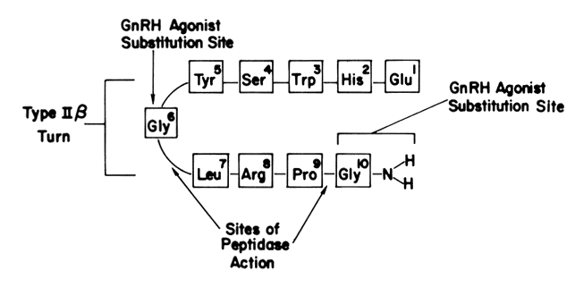 Structure of GnRH-Analogs Peptidases in the pituitary gland and hypothalamus rapidly degrade naturally occurring GnRH by cleaving the decapeptide molecule between amino acids Gly6 to Leu7 and at the Pro9 to Gly10 bond (Fig. 9).123, 124 Thus, the circulating half-life of GnRH is relatively short (2 to 8 minutes). It is believed that the bond between amino acids 6 and 7 is the most vulnerable to degradation by pituitary endopeptidases because of its location at the type IIb turn (hairpin turn) of the GnRH molecule.123, 124 Adequate hormone-to-receptor binding is thought to be due to the configuration of the molecule that is maintained by amino acids (Glul, Gly6, Gly10). GnRH agonists were developed to increase potency over naturally occurring GnRH through enhanced binding affinity to the GnRH receptor and decreased enzymatic proteolysis.123,125,126 Substitutions by metabolically stable residues in the above-mentioned positions (amino acids 6 and 10) result in increased potency and prolonged half-life.122 It also has been suggested that protection of the agonists from renal elimination by albumin binding may also account for their prolonged action.127 GnRH Antagonists Unlike GnRH agonists, which act by decreasing receptor availability and uncoupling, GnRH antagonists act by competing with GnRH for receptor sites, never causing a stimulatory signal. Therefore, antagonists have the advantage of a rapid onset of action without the initial stimulatory burst of gonadotropins. The pituitary response to GnRH antagonists differs in several ways when compared with their agonistic counterparts. The circulating levels of LH and FSH decline rapidly after the administration of a GnRH antagonist (maximal reduction occurring at 4 and 9 hours after an intravenous dose, respectively)128 and their pulse amplitudes are lowered (Fig. 10). Circulating gonadotropins return to basal levels and resume pulsatile release between 10 and 24 hours following GnRH antagonist administration. Contrary to the response to the agonists, the response to GnRH antagonists does not seem to vary during the menstrual cycle. The maximal decline of FSH, however, is slightly more profound in the midluteal phase.129 There appears to be a dose-dependent relationship between the GnRH antagonist administered and the LH response, a phenomenon also seen with GnRH agonists. Higher doses of GnRH antagonists act faster to abolish LH pulsation.130 The duration of LH suppression is dose-dependent as well.130 Nevertheless, suppression of plasma immunoreactive FSH was found to be insignificant at all doses and not dose-dependent. Thus, LH release is more profoundly inhibited than FSH, suggesting that a GnRH-independent releasing factor for FSH may operate as well.130 Interestingly, the antagonists were actually synthesized before the agonists.131 The idea of preventing ovulation by blocking the release of gonadotropins was initially exciting but later proved disappointing due to difficulties in developing a clinically useful GnRH antagonist.132 Indeed, the earlier generations of GnRH antagonists stimulated histamine release from mast cells, and therefore had anaphylactoid potential.133,134 Furthermore, some have agonistic properties.128 Particularly strenuous demands are put on GnRH antagonists for clinical use because as little as 10% receptor occupancy by GnRH can cause LH release,122,135 requiring the antagonist to be present continually at the receptor to block native GnRH binding. To accomplish their inhibitory action, antagonists are endowed with a long half-life and a high receptor affinity.132 In recent years, gonadotropin-releasing hormone antagonists that elicit minimal histamine release have been evaluated for clinical use. The potential benefits of an agent that lacks the initial stimulatory phase of the response to the agonist are self-evident. In clinical studies, GnRH antagonists have been shown capable of preventing premature LH surges in women undergoing ovulation induction.87,136,137 These agents have also been studied in men for the treatment of sex steroid-dependent disorders, such as benign prostatic hypertrophy.138 The promising data suggest the enormous potential for the application of GnRH antagonists in disorders in which GnRH agonists are currently indicated, including endometriosis and uterine leiomyomata,139 as well as the possibility of their use in the ovarian hyperstimulation syndrome, and breast and ovarian cancer.140 |