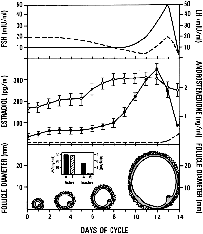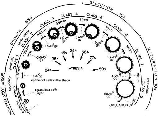 Typically, the human ovaries produce a single dominant follicle that results in a single ovulation each menstrual cycle (Fig. 1). In any given cycle, the dominant follicle must complete all the steps in folliculogenesis in a timely manner. In this capacity, it survives the negative events that operate to destroy the other follicles by atresia. Recognition that only a few follicles become dominant beautifully demonstrates the fundamental principle that folliculogenesis in mammals is a highly selective process. This chapter considers what is known about the process underlying the expression of the structural and functional organization of developing follicles and how they are controlled. |