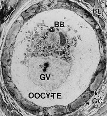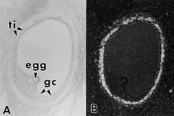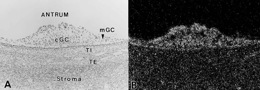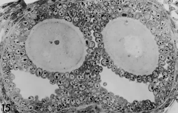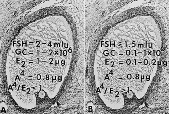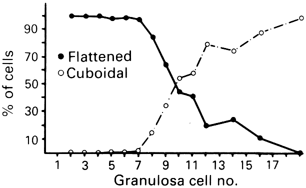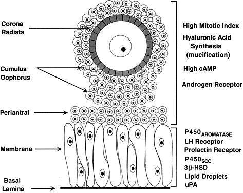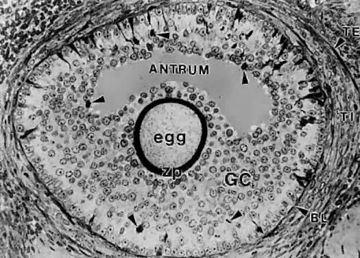 The theca interna is composed of differentiated TICs located within a matrix of loose connective tissue and blood vessels (Fig. 19). In all graafian follicle, LH is a key regulatory hormone for TIC function, and its importance in regulating TIC androgen production in vivo and in vitro has been established.27 Beginning at the very early stages of graafian follicle development, the TICs express their differentiated state as androgen (i.e. androstenedione-producing cells).27 The theca interna is richly vascularized and serves to deliver hormones (e.g. FSH, LH), nutrient molecules, vitamins, and cofactors required for the growth and differentiation of the oocyte and granulosa cells. We know little about the regulatory elements that control the theca vasculature. A functional link between the vasculature and graafian follicle development is suggested by the evidence43 that all monkey graafian follicles express high levels of FSH and LH receptor regardless of size, but when 125I-human chorionic gonadotropin (hCG) is injected systemically, only the dominant graafian follicle appears capable of accumulating 125I-hCG in the theca interna. These results suggest that the dominant graafian follicle expresses increased vascularization, which plays an important role in its selected maturation. In this regard, follicle-derived vascular endothelial growth factor44,45 and other angiogenic factors such as endothelin46 are being intensively investigated. The theca compartments (i.e. theca externa and interna) express their differentiated functions at the beginning of graafian follicle development (at cavitation) and appear to constitutively express a mature phenotype throughout the life and death of the graafian follicle. In a broad sense, there is little or no evidence that major changes occur in the theca layers during the various stages of graafian follicle development beyond those related to vascular and proliferative activities. This could imply that it is the granulosa cells (and perhaps the oocyte) that are variable and therefore responsible for graafian follicle diversity. In the graafian follicle, the granulosa cells and oocyte exist as a mass of precisely shaped and precisely positioned cells (Fig. 18). The spatial variation creates at least four different granulosa cell layers or domains: the outermost domain is the membrana granulosa, the inner most domain is the periantral, the intermediate domain is the cumulus oophorus, and the domain juxtaposed to the oocyte is the corona radiata (Fig. 20). A characteristic histologic property of the membrana domain is that it is composed of a pseudostratified epithelium of tall columnar granulosa cells, all of which are anchored to the basal lamina. The differentiation of a granulosa cell can be traced to its position within the cellular mass (Fig. 20). For example, cells in the membrana domain stop proliferating before those in central domain.47,48 The ability of the granulosa cells in the inner domains to continue dividing throughout graafian follicle development suggests they may be precursor cells. The cessation of mitosis in the membrana domain is characterized by the progressive expression of overt differentiation in which they assume the functional phenotype of fully differentiated cells. This process requires the temporal and coordinate expression of genes that form the basis of granulosa cytodifferentiation. The mechanisms by which this occurs involves ligand-dependent signaling pathways that are coupled to the activation and inhibition of specific genes. For example, normal differentiation of the membrana granulosa cells requires the activation of specific genes, including those for cytochrome P450 aromatase (P450arom)49 and the LH receptor,50 and the inhibition of structural genes in the apoptotic pathway. In contrast, the granulosa cells in the periantral, cumulus, and corona radiata domains proliferate, but they fail to express the genes that are involved in a terminal differentiation (Fig. 20). What controls granulosa heterogeneity? All the granulosa cells in the healthy graafian follicle express FSH receptor,13,51,52 and it has been shown that murine granulosa cells in the membrana and cumulus domains produce cAMP in response to FSH stimulation.53 These observations argue that post cAMP regulatory events are involved in the aspects of granulosa heterogeneity. The idea that the oocyte plays a key role in causing the different patterns of granulosa cytodifferentiation during graafian follicle development is supported by studies in rodents.54 A dialogue takes place between the oocyte and granulosa cells that has a great impact on folliculogenesis. In developing murine graafian follicles, the differential pattern of proliferation and differentiation between the granulosa in the membrana and cumulus domains are under the control of secreted oocyte morphogens.54 A novel TGF-β family member, GDF-9, was discovered in the mouse.24,25 Definitive evidence that GDF-9 is obligatory for folliculogenesis came from studies of GDF-9-deficient mice.26 In these animals, the absence of GDF-9 resulted in the arrest of follicle growth and development at primary stage and the females are infertile. These data support the idea that GDF-9 secreted by the egg is obligatory for graafian follicle development, granulosa cytodifferentiation and proliferation, and female fertility. The clinical relevance of this new concept is demonstrated by the presence of GDF-9 mRNA in the human ovary.25 The current challenges are to elucidate the mechanisms controlling GDF-9 expression and to identify the target cells for GDF-9 and the biologic processes that GDF-9 regulates. The concept that oocyte-derived growth factors control folliculogenesis and fertility could have important implications for human physiology and pathophysiology. Classification. All graafian follicles can be divided broadly into two groups: healthy and atretic (Fig. 21). The main difference between these two gro