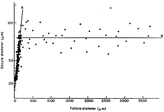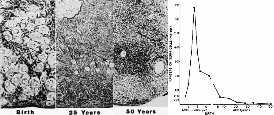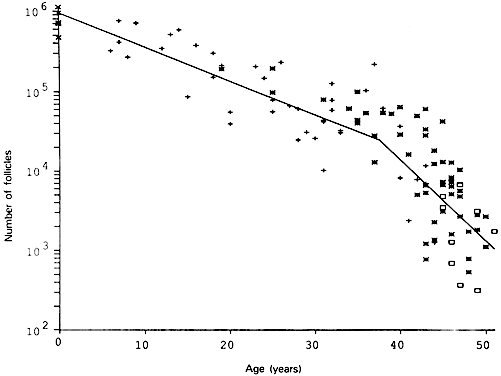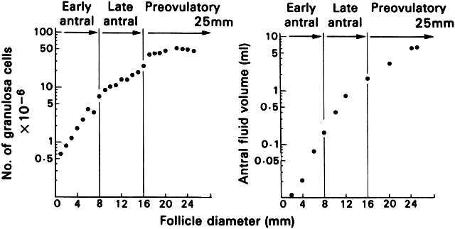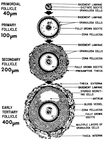 Folliculogenesis is the process in which a recruited primordial follicle grows and develops into a specialized graafian follicle with the potential to either ovulate its egg into the oviduct at mid-cycle to be fertilized or to die by atresia. In women, the process is long, requiring almost 1 year for a primordial follicle to grow and develop to the ovulatory stage. During the course of folliculogenesis, growth is achieved by cell proliferation and formation of follicular fluid, whereas development involves cytodifferentiation of all the cells and tissues in the follicle. Only a few follicles in the human ovary survive to complete the cytodifferentiation process, with 99.9% dying by a programmed cell death mechanism called apoptosis. The mechanisms regulating follicle growth and development are under the control of changing concentrations of ligands (i.e. hormones and growth factors). At the endocrine level, folliculogenesis is regulated by a central nervous system, anterior pituitary, and ovary cascade mechanism. Specialized hypothalamic neurons secrete pulses of gonadotropin-releasing hormone (GnRH) into the portal blood vessels, which acts on the gonadotrophs to cause a pulsatile release of follicle-stimulating hormone (FSH) and luteinizing hormone (LH), which act on ovarian follicle cells to control folliculogenesis. Although GnRH, FSH, and LH are critically important in regulating folliculogenesis, hormones and growth factors, which are themselves products of the follicle, can act locally to modulate (amplify or attenuate) FSH and LH action. This is the autocrine/paracrine system of developing follicles. It is believed that this local regulatory system plays an important role in the complex mechanisms governing the timing of folliculogenesis and whether a follicle becomes dominant or atretic. Chronology The steps and timing of human folliculogenesis are shown in Fig. 2. In women, folliculogenesis is a long process.1,2,3 In each menstrual cycle, the dominant follicle that ovulates its egg originates from a primordial follicle that was recruited to initiate growth almost 1 year earlier (Fig. 2). In a broad sense, there are two types of follicles (Fig. 2): preantral (primordial, primary, secondary [class 1], tertiary [class 2]) and antral (graafian, small [class 3, 4, 5], medium [class 6], large [class 7], preovulatory [class 8]). The development of preantral and antral follicles is gonadotropin independent and gonadotropin dependent, respectively. The rate of preantral follicle development is slow, requiring about 300 days for a recruited primordial follicle to complete the whole preantral period (Fig. 2). A long doubling time (about 10 days) for the granulosa cells is responsible for the slow growth rate. After antrum formation in the class 3 follicle (about 0.4 mm in diameter), the rate of growth accelerates (Fig. 2). The time interval between antrum formation and the development of a 20-mm preovulatory follicle is about 50 days (Fig. 2). The dominant follicle appears to be selected from a cohort of class 5 follicles at the end of the luteal phase of the menstrual cycle.1,2,3,4 About 15 to 20 days are required for a dominant follicle to grow and develop to the preovulatory stage (Fig. 2). Atresia can occur in all follicles (preantral and antral) after the class 1 or secondary follicle stage; however, the highest incidence is seen in the antral follicles that are more than 2 mm in diameter (i.e. class 5, 6, and 7) (Fig. 2). The Process Folliculogenesis occurs within the cortex of the ovary (Fig. 3). The follicles in the cortex are present in a wide range of sizes representing various stages of folliculogenesis. The goal of folliculogenesis is to produce a single dominant follicle from a pool of growing follicles. There are four major regulatory events involved in this process: recruitment, preantral follicle development, selection, and atresia. THE PRIMORDIAL FOLLICLE. All primordial follicles are composed of a small primary oocyte (about 25 μm in diameter) arrested in the diplotene (or dictyate) stage of meiosis, a single layer of flattened (squamous) granulosa cells, and a basal lamina (Fig. 4). The mean diameter of the human primordial follicle is 29 μm.5 By virtue of the basal lamina, the granulosa and oocyte exist within a microenvironment in which direct contact with other cells does not occur. The primordial follicles do not have an independent blood supply.6 It follows that primordial follicles have limited access to the endocrine system. Recruitment. The first major event in folliculogenesis is recruitment. Recruitment is the process by which an arrested primordial follicle is triggered to reinitiate development and enter the pool of growing follicles. All primordial follicles (oocytes) present in the human ovaries are formed in the fetus between the sixth and the ninth month of gestation. Because the entire stock of oocytes in primordial follicles is in meiotic prophase, none is capable of dividing mitotically. All oocytes (primordial follicles) capable of participating in reproduction during a woman's life are present in the ovaries at birth (Fig. 5). The total number of primordial follicles in the ovaries at any given moment of time is called the ovary reserve (OR).7 The process of recruitment begins soon after the formation of the primordial follicles in the fetus,8 and it continues throughout the life of the female until the pool of primordial follicles is exhausted at the menopause (Fig. 5). There is a bi-exponential decrease in OR during aging7,9,10 (Fig. 6). The number of primordial follicles falls steadily for more than three decades, but when the OR reaches a critical number of about 25,000 at 37.5 ± 1.2 years of age, the rate of loss of primordial follicles accelerates about twofold (Fig. 6). This change in OR is associated in an age-related decrease in fecundity, perhaps causal to the age-related increase in FSH that occurs in women after 36 years of age.7 Mech