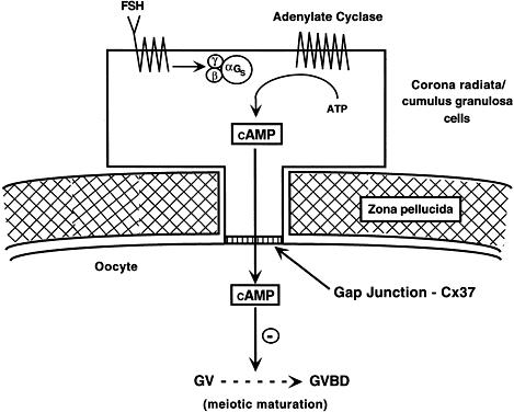 In the ovary (Fig. 27), the granulosa cells are the only cells that express FSH receptors.68 It follows that the primary mechanism by which FSH evokes dominant follicle formation is by stimulating FSH-dependent signaling pathways in the granulosa cells. How does this occur? The human FSH receptor is part of a large family of transmembrane receptors that regulate the heterotrimetric G proteins.69,70 The mature FSH receptor contains 678 amino acids (Mr 76,465) that are organized into three domains: