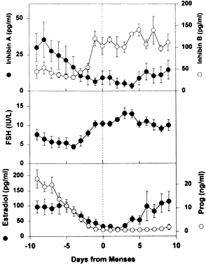 The entry of FSH into follicular fluid at cavitation is believed to provide the induction stimulus that initiates the process of graafian follicle growth and development. At the cellular level, it is the FSH receptor on the granulosa cell that is the fundamental player in this process. When an appropriate high FSH threshold is reached in one graafian follicle, it is selected to become dominant.31 In contrast, the small graafian follicles in the cohort with subthreshold levels of FSH become nondominant (Figs. 22 and 25). The mechanism whereby one small graafian follicle in a cohort is able to concentrate high levels of FSH in its microenvironment remains one of the mysteries in ovary physiology. An important point is that estradiol produced by the dominant follicle inhibits the secondary rise in FSH by a negative feedback mechanism (Figs. 24 and 26). This is believed to ensure a subthreshold level of FSH in the nondominant cohort follicles, which then leads to atresia. Mitosis in granulosa cells of atretic cohort follicles can be stimulated by treatment with human menopausal gonadotropin (hMG) during the early follicular phase.59 If FSH levels are increased to threshold levels within the microenvironment, then nondominant follicles may be rescued from atresia. This phenomenon could have implications for the way in which exogenous FSH or hMG triggers the formation of multiple dominant follicles in women undergoing ovulation induction.
