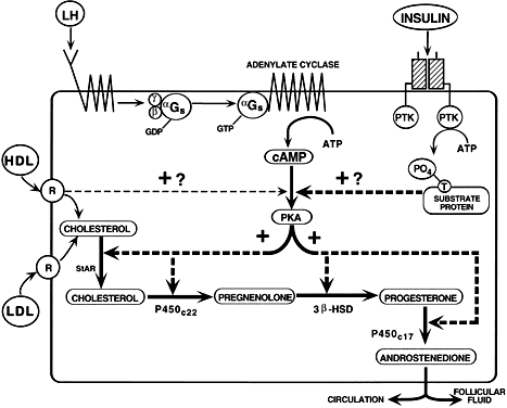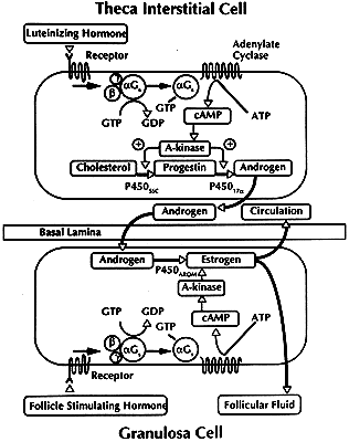 There appear to be at least three mechanisms that can terminate LH signaling. First, termination of the G protein signal occurs when bound GTP is hydrolyzed to GDP. The GTPase activity resides within the αGs molecule itself (i.e. the αGS is an intrinsic GTPase). The inactive αGs-GDP reassociates with the βγ complex and the activity of adenylate cyclase is shut off. Second, cAMP can be degraded by cyclic nucleotide phosphodiesterase. Third, a protein serine/threonine phosphatase (phosphatase type 2A) terminates the activity of the substrate proteins by dephosphorylating the phosphoserine and phosphothreonine residues. If a defect existed in the GTPase, phosphodiesterase, or phosphatase type 2A, ovarian interstitial cells might be expected to produce high levels of androstenedione continuously. In theory, this could also be a possible explanation for hyperandrogenism. However, further work is necessary to investigate this hypothesis. In addition to LH, other ligands can act to control TIC androgen production, including insulin, lipoprotein, activin, and inhibin. Insulin receptors with protein tyrosine kinase (PTK) activity have been identified in human TICs, and the ability of the insulin receptor signal transduction pathways to stimulate androstenedione production has been demonstrated.101,108,109 The mechanism of insulin-stimulated androgen production is not clear, but it may involve the activation of a family of PTKs that act and interact with the LH action downstream of cAMP (Fig. 32). Insulin by itself can increase androstenedione production, and insulin can synergize with LH to further increase androgen biosynthesis.101,108 The significance of these observations is demonstrated by the evidence that hyperinsulinemia can result in hyperandrogenism in some women.110 Insulin therefore appears to be an important physiologic stimulus for androstenedione production by TICs. LDL and HDL also stimulate steroidogenesis by human TICs, and they can cooperate with LH to effect further increases.101 Whether the in vitro stimulation of TIC androgen production by LDL or HDL has any physiologic meaning is not clear, but it may be worth pointing out that HDL is the most potent stimulator of TIC androgen production known.101 Activin111 and inhibin112 can inhibit and stimulate, respectively, androgen production by human TICs in vitro. We know nothing about the importance of activin and inhibin in regulating TIC androgen production in vivo. The Two-Cell, Two-Gonadotropin Concept.To understand the underlying mechanisms of follicle estradiol production, we need to consider steps that occur in the two-cell, two-gonadotropin concept (Fig. 33). In response to the LH, which is delivered to the follicle through the theca vasculature, there occurs an increase in the expression of specific steroidogenic genes in the TICs, which increases the synthesis of androstenedione. The level of androgen secretion reflects the presence within the theca of plus and minus factors, including insulin, lipoproteins, activin, and inhibin. Some of the TIC-derived androstenedione diffuses across the basal lamina and enters the follicular fluid and granulosa cells. In response to the P450arom induced by FSH in the granulosa, the androstenedione is aromatized to estrone, which then is converted to estradiol by 17β-HSD. These synthetic activities of the granulosa cells can also be modulated by a wide variety of regulatory molecules, such as the stimulators insulin113 and IGF-I114 and the inhibitors epidermal growth factor115 and tumor necrosis factor-α.116 The sum total of the ligand controls that operate to determine the activities of P450arom and 17β-HSD in the granulosa cells determines when and how much estradiol is produced by the dominant follicle. The estradiol molecules enter the follicular fluid and then diffuse into the theca vasculature, where they enter the systemic circulation. Atresia Through a process involving a programmed cell-death mechanism called apoptosis, 99.9% of the ovarian follicles die by atresia.55,117 During atresia, the oocyte and granulosa cells undergo a complex set of structural and functional changes that ultimately result in the entire loss of these cells from the follicle (Fig. 34). After some time, the follicular fluid is lost, and the follicle collapses. The theca exhibit little or no apoptosis. After atresia is complete, the TICs retain their position in the stroma and begin to carry out their functional activity as secondary interstitial cells (SICs).27 The SICs retain their capability of secreting androgens in response to LH and insulin stimulation.108 Accordingly, SICs play a role in determining the levels of androgen produced by the ovaries. Perhaps the most dramatic example is the production of abnormally large quantities of androgens in women with so-called “hyperthecosis.” When do follicles become committed to the atretic pathway? Results of morphometric studies indicate that atresia is a rare event in primordial and growing preantral follicles. However, once a preantral follicle proceeds into the graafian stages, apoptosis can occur. Little is known about the potential for a follicle to undergo apoptosis in any species; however, there is evidence that oocytederived GDF-9 may play a role in determining the apoptotic potential of growing follicles.26 If true, the oocyte may ultimately determine when a follicle acquires the capacity to die by apoptosis. A large-scale effort to study apoptosis has elucidated some of the molecular mechanisms.118 Anyone interested in exploring this subject in a comprehensive manner should consult the monograph by Wyllie et al.119 and the excellent mechanistic reviews in Science.120,121,122,123,124 At the level of the ovary, the molecular players and events involved in granulosa and oocyte apoptosis are becoming evident.125 An important concept that emerges from all this work is that apoptosis is controlled by a dynamic balance of plus (BCL family) and