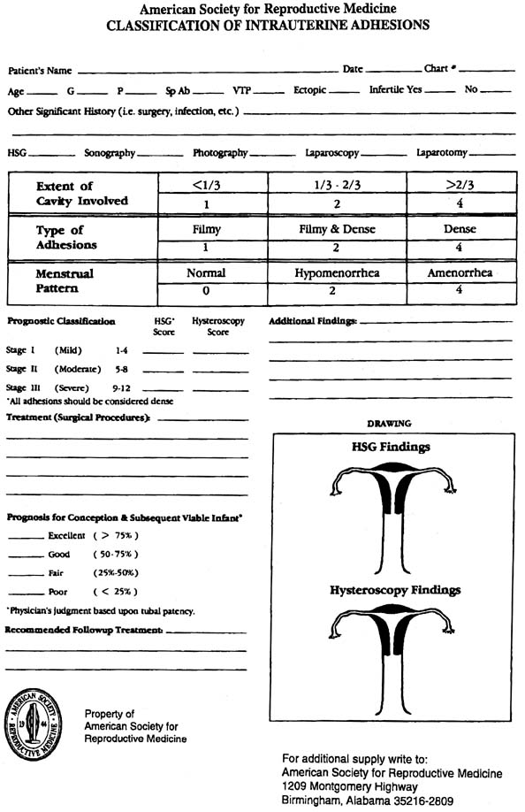 Amenorrhea associated with intrauterine adhesions was first described in 1894 by H. Fritsch in a patient after postpartum curettage.1 Subsequently, in 1948 and 1950 J. G. Asherman published two reports2,3 on the frequency and the etiology of intrauterine adhesions and the eponym Asherman's syndrome has been used ever since. Many case series have appeared in the literature describing diagnostic, therapeutic, and adjunctive methods to address intrauterine adhesions. However, no randomized control trials have been conducted to assess or compare the efficacy of any of these techniques. |