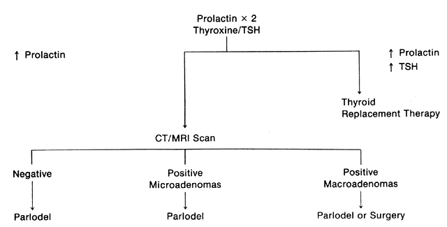 The patient who presents with galactorrhea should undergo an extensive history and physical examination to determine the cause of the problem (Fig. 1). A serum prolactin level should be measured because the absolute level is often predictive of the type of pathology. For instance, a pituitary tumor is found 25% of the time with a prolactin level of 50 ng/mL, 50% of the time with a level of 100 ng/mL, and almost 100% of the time with a level of 200 ng/mL.65 Drug intake rarely produces hyperprolactinemia above 60 ng/mL. When measuring serum prolactin levels, the physician should remember that this is a dynamic, stress-related hormone. Numerous physiologic events are associated with hyperprolactinemia, including prior breast or pelvic examination, food intake (particularly the amino acid arginine), and time of day, because prolactin has a sleep-entrained rhythm.66 In general, samples for serum prolactin levels should be drawn before examination, later in the morning to early in the afternoon, and at least an hour away from meals. If an elevated level is found on the initial sample, one or two repeat samples should be drawn, along with a sample for thyroxine and TSH determination to rule out compensated primary hypothyroidism. In addition, one could argue for the measurement of serum growth hormone and ACTH to rule out a polyendocrinopathy, although this is rarely discovered.