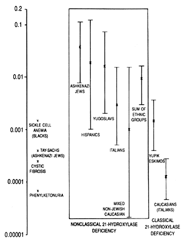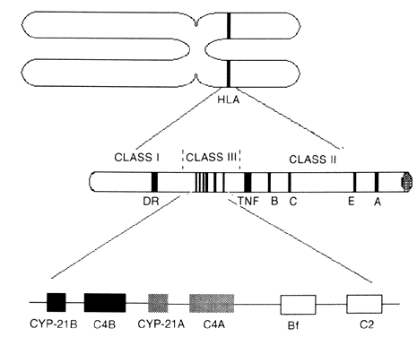Congenital adrenal hyperplasia (CAH) is a group of common inborn errors of metabolism that are transmitted as autosomal-recessive traits.1,2 These enzymatic deficiencies cause impaired cortisol production as a result of their intermediary role in the steroidogenic pathway that converts cholesterol to cortisol. When cortisol production is decreased, the level of adrenocorticotropic hormone (ACTH) rises because of the absence of negative feedback.3 Because the body attempts to maintain normal cortisol levels, there is overproduction and accumulation of cortisol precursors proximal to the enzymatic block. These precursors are shunted toward the production of C19 androgens (androstenedione and testosterone), leading to the clinical manifestations of virilization and hirsutism. The 21-hydroxylase (21-OH) and 11β-hydroxylase enzymes also are used in the mineralocorticoid pathways whose end product is aldosterone. When the enzyme is defective in this pathway, patients cannot conserve sodium. This condition leads to the salt-wasting form of the disease. Patients with the classic neonatal forms have sexual ambiguity, progressive virilization, and sometimes salt loss or hypertension. These conditions require life-long medical management4 and often surgical reconstruction of the deformed genitalia.5 The nonclassic (asymptomatic) and late-onset (usually pubertal) forms are more common than the classic presentation. The most common form of classic CAH is 21-hydroxylase deficiency (CAH21), which accounts for 95% of the cases of CAH. The next most common forms are 3β-hydroxysteroid dehydrogenase deficiency (CAH3β-HSD) and 11β-hydroxylase deficiency (CAH11β).2 21-Hydroxylase Deficiency In CAH21, the abnormality is in the 21-OH enzyme (P45021), blocking the conversion of hydroxyprogesterone (17OHP) to 11-deoxycortisol (compound S). Basal circulating levels of both progesterone and 17OHP are elevated in the classic form, but usually only after ACTH stimulation in the cryptic, heterozygote, or attenuated (late-onset) varieties of CAH21. GENETICS. The different types of CAH21 can be attributed to multiple allelic variations encoding the cytochrome P450 enzyme, which performs 21-hydroxylation (CYP-21). Molecular studies showed two copies of the gene on the short arm of chromosome 6 in the class III region of the human lymphocyte antigens (HLA) complex (Fig. 1). The HLA genetic region encodes genes that have multiple allelic variants that determine histocompatibility. Other genes are located in the class III region, including the 21-hydroxylase genes, two complement factor 4 genes (C4), properidine factor B gene (Bf), and complement factor 2 gene (C2). The two 21-hydroxylase genes (CYP-21A and CYP-21B) alternate with the two genes that encode C4. The class III region of the HLA complex is located between the HLA class II region DR gene and the class I region tumor necrosis factor and HLA-B genes.6,7,8,9 The CYP-21B gene is functionally important, but the CYP-21A gene is a pseudogene; the gene product is enzymatically inactive.9,10,11 Gene deletions and substitutions in the CYP-21B gene affect P45021 function. Because the HLA genes are located in the same portion of chromosome 6 as the CYP-21 genes, certain allelic HLA variants are inherited together (genetically linked) with specific CYP-21 mutations. The HLA haplotype A1 B8 DR3 is associated with a CYP-21A gene deletion, but patients are phenotypically and hormonally normal. In contrast, the A3 BW47 DR7 haplotype, in which the CYP-21B gene is deleted,12 is associated with the salt-wasting form of CAH.13 Werkmeister and colleagues11 showed that 25% of patients with classic CAH carried alleles that had CYP-21B gene deletions, despite varied HLA compositions. The remaining 75% had smaller de novo point mutations that caused amino acid substitutions in the CYP-21B gene, thereby rendering the enzyme nonfunctional. Seventy-four percent of the mutations are caused by gene conversions from CYP-21A to CYP-21B.14 Deletions or further duplications of the C4 and CYP-21 genes can occur as a result of unequal crossover due to misalignment of close spacing of homologous genes during meiosis.11,15 Triplication of the C4 and CYP-21 genes most frequently is associated with the late-onset form of CAH21.16 The B14 DR1 haplotype that is associated with 78% of cases of late-onset CAH21 features an extra C4B and CYP-21A gene as well as a valine-to-leucine mutation at codon 281 of the CYP-21B gene that normally is present in the CYP-21A gene. This codon in the CYP-21B gene is conserved in several mammalian species.14,17 The resultant amino acid change promotes a break in an α-helix that is required for optimal enzyme function. Other mutations transferred from the CYP-21A to the CYP-21B gene have been identified. These mutations include the transfer of a nonsense mutation to codon 318, which causes the salt-wasting form of CAH; an isoleucine-to-asparagine change, which cause the simple virilizing form; an eight-base pair deletion, which produces a nonfunctional protein because of a frame shift that causes the salt-wasting form of the disease; and a conversion of the sixth intron to part of the seventh exon, which causes the late-onset form. A triple substitution of tyrosine for adenosine in the sixth exon occurs with equal frequency in all three forms of CAH21.14 In addition, random point mutations that change single amino acids may cause abnormal protein function of the CYP-21B gene product. For instance, the late-onset form of CAH21 is associated with a guanosine-to-cytosine substitution in the seventh exon.14 CLINICAL PRESENTATION. Depending on the severity of the P45021 defect, the presentation of CAH can vary from the severe classic virilizing form to the late-onset form, in which hirsutism develops at puberty, to the cryptic (asymptomatic) form, which can be detected only by genetic linkage studies or provocative hormonal testing.18 In the classic form, the female neonat
