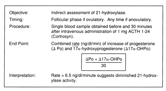 A potent mineralocorticoid, 9α-fluorohydrocortisone or fludrocortisone (Florinef, Squibb Mark, Princeton, NJ; 150 μg/m2/day, 0.2 mg/day), should be started when salt wasting develops in infants with CAH. Salt supplementation of 2.2 mmol/kg/24 hours may be required in the acute phase. Plasma renin levels should be observed to assure that they are normal. Excessively large amounts of hydrocortisone may be needed if fludrocortisone is insufficient.82 Inadequate replacement can cause failure to thrive. Extensive clinical experience shows that suppression results in the resumption of menstrual cycles in anovulatory patients.4,73,83 Although the reason for the improvement in ovulatory status remains uncertain, a reduction of the total effect of androgen, perhaps at the central as well as the intraovarian level, may be responsible. Clearly, androgens may exert a negative feedback effect on gonadotropin release and also may arrest follicular development. If adequately treated, patients with classic CAH will have normal pubertal progression.73 Although late-onset CAH is thought to be best treated by glucocorticoid replacement, a recent study suggested that treatment with cyproterone acetate, a peripheral androgen inhibitor, provides greater clinical improvement in hirsutism scores despite continued abnormalities in androgen profiles.84 Prenatal treatment of female fetuses was encouraged by David and Forest,85 who noted less virilization in females who had CAH21 and had been treated with dexamethasone than in their older, untreated affected sisters. The basis of prenatal treatment presupposes that the fetus has an intact pituitary adrenal axis controlled by ACTH. Gestational treatment with both dexamethasone and hydrocortisone has been attempted.86,87,88,89 Dexamethasone is the drug of choice because its transplacental passage is far greater than that of cortisol.88 Marked suppression of the adrenal gland was shown after treatment of affected female fetuses with dexamethasone as assessed by the low levels of estriol (fetal androgen metabolite) in the amniotic fluid and maternal urine.89 A dose of 20 μg/kg prepregnancy weight, provided in three equal doses, is recommended (approximately 5 mg/three times a day). Low-dose dexamethasone treatment during pregnancy was not teratogenic.2,87,88 |