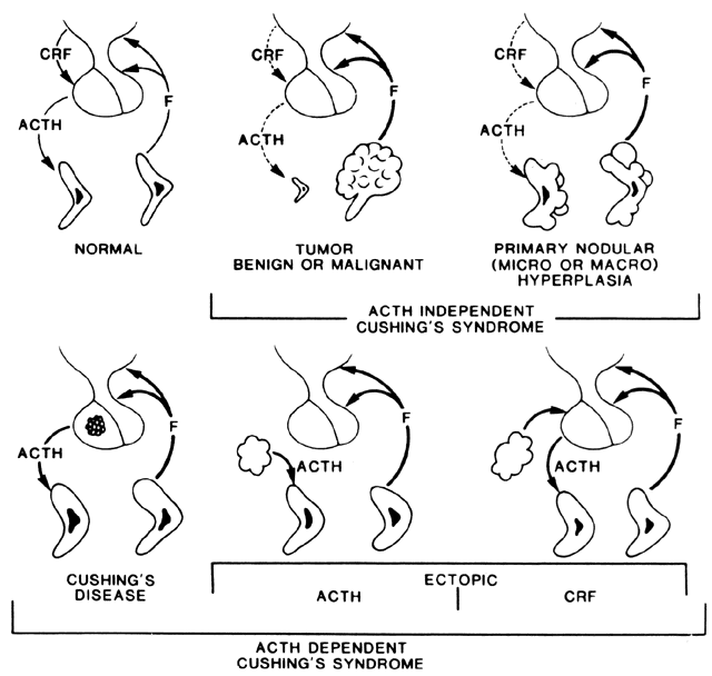 ACTH, adrenocorticotropic hormone (Carpenter PC: Diagnostic evaluation of Cushing's syndrome. Endocrinol Metab Clin North Am 17:445, 1988) Primary bilateral nodular hyperplasia increasingly has been recognized as a cause of Cushing's syndrome. The incidence ranges from 7% to 40% in various series. It is unclear whether this occurrence is a primary adrenal phenomenon or an autonomous pituitary hypersecretion of ACTH.95 There may be several forms of nodular hyperplasia. Some cases are identified in families who have the HLA A1 B8 DR3 haplotype and in whom transmission is thought to be autosomal dominant with variable penetration. In these families, adrenal nodular hyperplasia is associated with cardiac myxoma and spotty pigmentation (lentigo) of the skin. Immunoglobulin G produced by affected siblings can induce cortisol production in guinea pig adrenal glands; therefore, in some patients, nodular adrenal hyperplasia appears to have an autoimmune component.96 Finally, when Cushing's syndrome is associated with true virilization in addition to hirsutism, adrenal carcinoma must be considered a likely cause.91,97,98 Clinical Presentation Numerous clinical features may suggest Cushing's syndrome. Progressive central (truncal) obesity, facial rounding (moon facies), and supraclavicular and cervicodorsal fat pads (buffalo hump) representing fat redistribution are the most common manifestations. Changes in protein metabolism cause easy bruising, purpura, and plethoric appearance. Deep red and purple striae, particularly when more than 1 cm wide, suggest hypercortisolism,91 especially when they occur in atypical locations, such as the axillary area, inner thigh, or chest. Progressive hyperpigmentation may occur in patients with Cushing's syndrome associated with high levels of circulating ACTH. It is especially pronounced in patients with ectopic ACTH-producing tumors. ACTH probably plays a primary role in the hyperpigmentation, although over pro-opiomelanocortin (POMC) products may be involved. Cushing's disease secondary to pituitary hypersecretion of ACTH is most common in women between the ages of 20 and 40 years.98 The clinical symptoms usually are mild, and they progress gradually. In contrast, Cushing's syndrome due to ectopic ACTH production usually has a rapidly progressive course. It occurs most frequently in patients older than 50 years, and classically is accompanied by hypernatremic, hyperchloremic, and hypokalemic alkalosis, and hyperpigmentation. This variety generally is caused by oat cell carcinoma of the lung, pancreatic islet cell carcinoma, or thymoma.99,100 However, when Cushing's syndrome is caused by a sudden and relatively short-term exposure to hypercortisolism (i.e., carcinoma), patients show little in the way of the Cushing phenotype, which requires chronic glucocorticoid excess. Hirsutism is a feature of Cushing's syndrome in approximately 60% of patients. The hirsutism typically is moderate, and it may be associated with acne and amenorrhea in approximately 40% and 50% of cases, respectively.98,101 Highly elevated circulating levels of DHEA, DHEAS, testosterone, and androstenedione are suggestive of adrenal carcinoma.102,103 Cushing's syndrome due to adrenal adenoma usually is not associated with hirsutism, and these patients may have low-normal DHEAS values. Indeed, cortisol-producing adrenal adenomas tend to suppress the pituitary release of ACTH, thereby causing atrophy of the contralateral adrenal gland. Excess levels of cortisol increase the rate of catabolism, resulting in generalized muscle wasting and weakness that typically is most prominent in the proximal limb muscles. In patients with excess levels of mineralocorticoid, hypokalemia may contribute to the weakness.104 If hypercortisolism is present in childhood, the catabolic effects result in short adult stature. Longitudinal growth of bone commonly is retarded by the excess circulating cortisol, epiphyseal maturation may be accelerated by increased concentrations of circulating adrenal androgens, and abnormal hypothalamic-pituitary function may inhibit the release of growth hormone. Abnormal glucose tolerance test results are present in most patients. The fasting serum glucose level usually is normal, but there is a delayed return to normal after glucose loading. Fractures that occur after minimal trauma and back pain with unsuspected spinal compression fractures are not uncommon105 due to the decrease in protein matrix synthesis by osteoblasts and increased bone resorption. Osteoporosis may be evident radiologically. Hypertension is a frequent finding in noniatrogenic Cushing's syndrome. Although the hypertension rarely is severe, affected persons occasionally have left ventricular hypertrophy and changes in the electrocardiogram result. The mechanisms involved include the salt-retaining action of high levels of circulating glucocorticoids, enhanced vascular reactivity to vasoactive substances such as norepinephrine and angiotensin II, and activation of the renin-angiotensin system.106 Chronic disease also can be associated with an increased risk of vascular occlusion and myocardial infarction. Dependent edema occurs in some patients; it appears to be due to a combination of the salt-retaining action of steroids and a decrease in tissue support. Psychiatric disturbances are common.107 Especially frequent are irritability, mood disturbances, impaired memory and concentration, insomnia, and a decrease in libido. Thought disorders, including paranoid and confusional states, occur less frequently. These more severe impairments are associated with particularly high concentrations of ACTH and cortisol. Other POMC products may contribute directly to the psychiatric manifestations. In general, the psychiatric disturbances improve after medical or surgical therapy for Cushing's syndrome, although they may persist to a lesser degree for years. Hematologic manifestations include mild erythrocytosis, granulocytosis, l