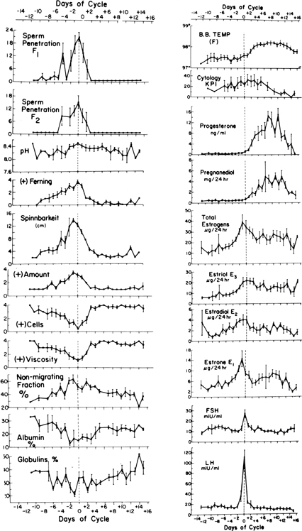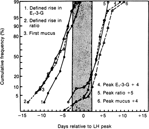 The blood basophil count has been found to decrease significantly on the day of ovulation; this change did not occur in anovulatory cycles.56 Similarly, the value of the leukocyte alkaline phosphatase relative score, based on the degree of intensity and quantity of the precipitated dye within the cytoplasm of stained segmented and band-form neutrophilic granulocytes, has been found to correlate closely with the LH surge and the preovulatory urinary estrogen surge.34 Further studies have shown that the leukocyte alkaline phosphatase relative score peak occurred either 1 day before or on the day of the LH surge. Effective use of these methods requires serial blood sampling, which would make their usefulness somewhat limited. Measurements of salivary and vaginal electrical resistance have also been evaluated for predicting and confirming ovulation. A device called the CUE Fertility Monitor (Zetek Inc., Aurora, CO) has been developed to measure the electrical resistance of vaginal mucus and saliva. The instrument is a battery-operated device with a digital readout that indicates the measured resistance at the sensors. In recent decades, a number of studies have been conducted to determine the usefulness and accuracy of CUE ovulation predictor. These studies used either LH surge in the serum or urine as a comparison marker of ovulation. Taken together, these studies indicate that the accuracy of CUE ovulation predictor in identifying the fertile period (preiovulatory) is similar to cervical mucus method,57 but further field trials will be needed to test the reliability and sensitivity of the device in ovulation timing. With rapid technological progress and new insight into the intricate process of reproduction, new markers of ovulation and the fertile period will undoubtedly be identified. Among these markers, some have already been investigated and techniques for their detection and validation are being tested. Inhibin or folliculostatin, a nonsteroidal protein substance produced by the granulosa cells of the ovary, shows a progressive increase during follicular development and may be a useful marker. Levels of follicle-regulating protein, which is also produced by the granulosa cells, rise progressively both in blood and urine during the menstrual cycle. The rise begins about 6 days before the day of the LH surge, with a further rise in the luteal phase.58 |