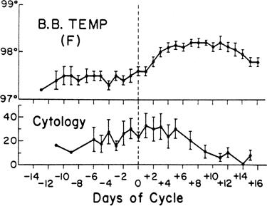 Basal Body Temperature In 1904, van de Velde observed that body temperature obtained at basal level during the menstrual cycle shows a biphasic pattern. Monitoring of basal body temperature (BBT) has been found to be one of the simplest and most practical means of ovulation detection. In practice, women are instructed to take their oral, vaginal, or rectal temperatures with a basal thermometer every morning on awakening, before getting out of bed or doing any physical activity. A period of 6 to 8 hours of uninterrupted rest is deemed necessary before the temperature is obtained. The temperature record shows a typical biphasic pattern during ovulatory cycles; in anovulatory cycles it remains monophasic. A preovulatory dip (possibly coinciding with estrogen peak) is usually, but not invariably, observed.21 The WHO definition of changes in BBT indicates that a shift in BBT to the hyperthermia phase of the cycle should occur within a period of 48 hours or less. Three consecutive daily BBTs should be at least 0.36°F (0.2°C) higher than the previous six daily temperatures.21 In a study of 10 normal women, cyclic fluctuations of gonadotropins and ovarian steroids were simultaneously measured and correlated with the BBT. The mean BBT was 97.48°F ± 0.25° (36.37°C ± 0.12°) during the follicular phase and 98.09°F ± 0.22° (36.72°C ± 0.12°) in the luteal phase. The BBT began to rise simultaneously with the LH surge. A significant rise did not occur until 2 days after the LH peak. This coincided with the rise of serum progesterone to a mean level above 4 ng/mL and urinary pregnanediol to greater than 1.8 mg per 24 hours (see Fig. 1 and Fig. 3). After the rise, the BBT remained 98°F until serum progesterone declined below 4 ng/mL and urinary pregnanediol to less than 1.8 mg per 24 hours. The BBT rose significantly during midcycle above the follicular phase level and increased further to a highly significant degree during the luteal phase.2 These observations confirm that the rise of BBT precedes or coincides with ovulation and is associated with the increased production of progesterone by the ovary. The BBT record does not predict the day of ovulation but rather provides evidence of ovulation 2 or 3 days after it has occurred.2,21,22 Biphasic BBT is usually indicative of an ovulatory cycle, although a monophasic BBT may be observed in some ovulatory cycles.23,24 The reason for the absence of thermogenic response to ovulatory levels of progesterone in these cases is unknown. The rise in temperature is secondary to progesterone, and the primary reason for the rise is the increase in the production and secretion of norepinephrine, which is a thermogenic neural hormone. The reliability of BBT to detect ovulation has been studied repeatedly. In a retrospective assessment of 210 biphasic BBT records, the thermal nadir occurred within 1 day of the urinary LH surge in 75% of the cases and in 90% within 2 days.25 In the prospective study reported by Guermandi and colleagues11BBT records were compared to LH, E2, and progesterone in the serum and follicular collapse demonstrated by daily ultrasound. BBT reading showed 0.77 sensitivity, 0.33 specificity, and 0.74 accuracy for ovulation documentation. In infertility evaluation, the patient should be instructed to record her BBT during the entire course of the menstrual cycle for several months. This is done in an effort to document the occurrence as well as normalcy of the ovulatory process. A prolonged follicular phase and short luteal phase (less than 12 days’ duration) may be contributing factors to infertility. Several computerized or digitalized BBT recording devices have been developed to identify the fertile period more accurately. The Thermodigital thermometer is a solid-state electronic oral thermometer that uses microcomputer-assisted, repeated calculations to give a digital LCD in 60 seconds. The Rabbit Computer Corporation (Los Angeles, CA) has developed a fertility indicator for home use called The Rabbit. This device uses BBT measurement and a built-in computer program to predict the preovulatory period by documenting prior cycle lengths. The device also has a built-in alarm to awaken the user and can visually graph out up to 12 prior cycles of BBT measurement. Two other sophisticated, but rather expensive, devices available are the Rite Time (Rite Time Ltd., United Kingdom) and Fertil-A-Chron (Fertil-A-Chron Inc., Hauppauge, NY). The latter product incorporates an electronic digital oral probe and an alarm system to remind the user to take her BBT. A device called Bioself Fertility Indicator (Bioself Distribution SA, Geneva, Switzerland) has been marketed for the purpose of integrating findings of BBT and menstrual cycle records.26 It consists of an electronic thermometer that registers the daily morning temperature, as well as the first day of each menstrual cycle. A unique algorithm programmed into the microprocessor chip calculates when the temperature shifts from the lower to the higher level after ovulation. The method is based on a calculation involving the observation of about six menstrual cycles and the deduction of 18 days from the shortest cycle and 9 days from the longest. The interval between these two points represents the fertile period of the following cycles. The use of this device as a contraceptive in field trials has been reported to result in a pregnancy rate of 9 per 100 women year and the 1-year discontinuation of 32.5%.27 Another device, the Ovudate fertility test kit (Franklin Diagnostics Inc., Morristown, NJ), measures core temperature using a first morning urine sample. Royston,28 in collaboration with a WHO task force, has shown that a modified form of cumulative sum test (CUSUM), a method commonly used in industrial quality control to detect drift away from a preset target value, may be used as a sensitive and reasonably reliable method for picking up a signal represented by a change in the mean level of 