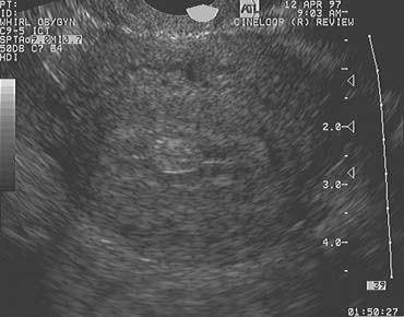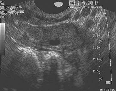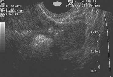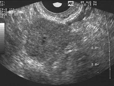 The myometrium does not change in appearance in any recognizable way across the menstrual cycle. Its echotexture generally appears homogenous. The major vasculature that supplies the uterus is quite distinct, particularly at the interface with the broad ligaments. Blood vessels in women who have previously been pregnant generally are demonstrably larger than those in nulligravida women. TVUS has proven value for the diagnosis of uterine pathology.21,22,23,24,25 Uterine leiomyomata arising within the myometrium are exceedingly common. Their location and size can be accurately mapped with TVUS, allowing for ready recognition of any significant changes that may occur over time. Their correlation with infertility or recurrent pregnancy loss remains unclear and longitudinal studies involving serial TVUS examinations may prove useful to better-define any role they may play.23 In those who may benefit from myomectomy, preoperative TVUS can help to define the number and location of the myomas to be removed. TVUS may also be used to assess the effectiveness of preoperative treatment with gonadotropin-releasing hormone agonists when such treatment is used to reduce the size of myomas to facilitate their removal or limit intraoperative blood loss. TVUS has been advocated for the diagnosis of adenomyosis,24 but diagnosis of this enigmatic disorder remains difficult. Used alone or in combination with HSG, TVUS has not proven its value for this purpose. Color-flow mapping with TVUS may offer additional accuracy, but its application for diagnosis of adenomyosis remains investigational.27 Nabothian cysts of varying diameter are frequently observed and not particularly noteworthy. Small cystic inclusions may also be seen at higher locations, at the junction of the internal cervix and the lower uterine segment, and at various intrauterine locations. Their relevance when identified in women under evaluation for reproductive failure is unknown and currently undergoing study. |