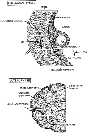Normal corpus luteum formation and function begin in the follicular phase with recruitment of a cohort of growing follicles primarily under the influence of follicle-stimulating hormone (FSH). By cycle day 7, usually a single dominant follicle emerges as the major source of circulating estradiol (Fig. 2). The microstructure of this dominant follicle comprises an inner layer of granulosa cells, whose aromatase activity converts ovarian androgens to estrogens. The androgens that originate in the outer thecal layer of cells diffuse into the inner granulosa layer. With the estradiol peak and the LH surge at mid cycle, angiogenic factors, such as vascular endothelial growth factor, cause extension of blood vessels past the defunct basement membrane into the previously protected granulosa layer, providing cholesterol substrate attached to low-density lipoproteins (LDLs) for progesterone production (Fig. 3).26 The dominant follicle is transformed into the corpus luteum. By this point in the cycle, granulosa cells that previously produced only low levels of progesterone have acquired LH receptors under the influence of FSH. In the luteal phase, under the stimulatory influence of pulsatile LH in nonconceptive cycles or human chorionic gonadotropin (hCG) from the early embryo and trophoblast in conceptive cycles, the corpus luteum continues to produce and secrete progesterone and other hormones (e.g., relaxin, inhibin, estradiol, oxytocin, prostaglandins).