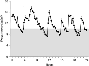 In a similar fashion in conceptive cycles, continuation of pregnancy depends on tropic support of the corpus luteum by hCG elaborated by the early trophoblast. Apparently the corpus luteum becomes increasingly less sensitive to LH stimulation with a preferential response to hCG support as ovulation becomes more remote. Without adequate hCG, luteolysis takes place, with ensuing pregnancy failure. Conceivably, alterations in the hCG molecule affecting its bioactivity or in the pattern of its secretion could disturb this luteal rescue function. This hypothesis is theoretical at present but offers a provocative target for future research. The aforementioned two-cell compartmentalization of the corpus luteum has led to studies of LPD based on hypothetical failure of specific cell types. Hinney and colleagues28 investigated LH pulsatility in 38 women with LPD diagnosed by two consecutive cycles marked by diminished mid luteal progesterone levels. They described three distinct patterns of luteal phase failure. Group 1 consisted of 16 women (42%) who had no LH secretory episodes and had significantly lower basal LH levels compared with 14 control subjects. Group 2 consisted of 13 women (34%) who had normal LH secretory episodes despite low estradiol and progesterone concentrations that did not respond to the LH pulses. Group 3 consisted of nine women (24%) who had normal LH pulses with an adequate progesterone response but inadequate basal secretion of progesterone. All immunoreactive LH pulses also were found to be bioactive. Group 1 subjects were designated as having a hypothalamic cause of LPD (inadequate stimulation). Group 2 women, because of their lack of response to LH pulses, were categorized as having a small cell defect. Group 3 women, with low basal levels of progesterone and appropriate responses to LH episodes, were categorized as having a large cell defect. These findings led to intriguing implications for the management of patients with LPD. Patients found to have an increase in serum progesterone levels in response to LH stimulation (large cell defect) may be treated adequately with exogenous hCG; patients with inadequate LH response (small cell defect) may be treated preferentially with progesterone supplementation. Further investigation is needed to verify these findings and to characterize the specific cellular defects within these subtypes. Further analysis of LPD has focused on the quantity and quality of progesterone produced by the corpus luteum. The difficulty in assessing the former is the wide fluctuation in serum progesterone levels over a 24-hour period. One study using frequent blood sampling in normal women during the mid and late luteal phases found the mean percentage variation in progesterone over 24 hours to be 99% and 138% (Fig. 12).59 No identifiable circadian pattern of secretion was established. This level of variation affects the interpretation of single or multiple values in the assessment of luteal adequacy. By increasing the number of data points, however, one may limit the amount of variance and obtain a more accurate estimate of the true mean. This principle, previously referred to as regression toward the mean, allows accurate comparison of women and groups in terms of their corpus luteum secretory capacity using integrated daily luteal phase progesterone levels. Numerous studies that have undertaken such measurements have confirmed that a subset of women exist with decreased quantities of progesterone compared with controls. In some cases, the typical bell-shaped curve of progesterone levels is attenuated, and in others, progesterone peaks early, with significant shortening of the overall luteal phase duration. Intuitively, in cases in which histologic LPD exists despite adequate immunoreactive levels of progesterone in the serum, there may be abnormalities of the bioactive fraction of progesterone. A study by Minassian and Wu70 specifically addressing this issue could not show a difference, however, in the amount of free and protein-bound progesterone between normal and histologic LPD cycles.