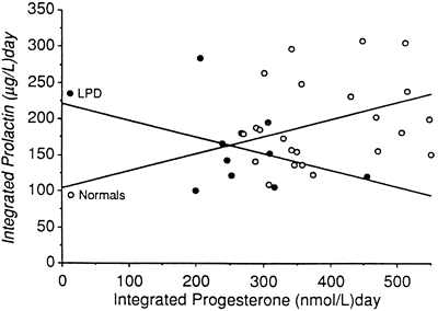 Hyperprolactinemia Prolactin is a single-chain polypeptide hormone 198 amino acids in length that circulates in multiple isoforms with varying bioactivity. It is secreted mainly from the anterior pituitary in a pulsatile fashion under tonic inhibition by hypothalamic dopamine. It also is secreted by the placenta and uterine decidua and is thought to play a role in steroidogenesis by luteinized granulosa cells. A landmark study by McNatty and colleagues in 197490 looked at the effects of prolactin on the ability of cultured luteal cells to produce progesterone. They found that neutralization of prolactin in the culture medium with a specific antibody or addition of prolactin over a threshold level led to diminished daily progesterone production in vitro. Further in vivo evidence for modulation of progesterone secretion by prolactin in normal women came from studies of induced mild hyperprolactinemia, in which luteal phase serum levels of progesterone were reduced.21,22 A separate investigation of normal women found decreased luteal progesterone secretion when prolactin levels were decreased to below normal with a dopamine agonist.91 Whether the latter effect was due to direct effects of dopamine on prolactin secretion or on the GnRH pulse generator is unclear, but it was not unexpected given the importance of prolactin for activation of the 3β-hydroxysteroid dehydrogenase enzyme in the ovary.92 Collectively, these studies of normal women with induced changes in prolactin levels support the earlier modulation of corpus luteum steroidogenesis by prolactin as suggested by McNatty and colleagues.90 It seems that optimal corpus luteum function as determined by progesterone secretion depends on a certain level of prolactin, and a change (either increased or decreased) in prolactin leads to decreased levels of progesterone. Evidence for prolactin’s role as a modulating factor in corpus luteum function has emerged from several studies of women with LPD. Huang and associates23 studied 151 women with out-of-phase endometrial biopsy specimens by measuring serum prolactin levels for 3 to 4 days in the periovulatory period. They found that 33 subjects (22%) had transient elevation in prolactin to greater than 20 ng/mL. They also noted decreased pooled progesterone levels in the mid luteal phase in the transiently hyperprolactinemic women compared with controls. Scaglia and colleagues93 reported nocturnal elevation of prolactin in six women with LPD diagnosed by histologic and serum criteria, four of whom had normal daytime levels of prolactin. Aisaka and coworkers94 found the incidence of transient hyperprolactinemia to be 62.2% in 201 cases of LPD diagnosed by a combination of basal body temperature (BBT) and serum progesterone criteria in their clinic population. In addition to the transient elevations described previously, sustained hyperprolactinemia may contribute directly to decreased luteal progesterone production. Del Pozo and colleagues24 studied eight women with galactorrhea or hyperprolactinemia with short luteal phases and found integrated luteal progesterone values greater than 2 SDs below control values. These findings corroborate the theory proposed by Bahamondes and associates95 that LPD is part of the natural sequence of events between normal ovulatory cycles and amenorrhea that occurs in women with progressive hyperprolactinemia. Part of the difficulty in interpreting the causal influence of hyperprolactinemia on luteal function is the normal variability of serum prolactin levels. Fujimoto and coworkers96 showed a circadian pattern of prolactin secretion with a definite nocturnal rise in normal women. In addition, secretory prolactin peaks approaching the threshold of normal values (20 ng/mL) regularly appeared in the ovulatory and late luteal periods in their study. Prolactin levels were above normal 20% of the time when drawn between 8 and 10 a.m. in the 28 normal women studied. A single measurement is of limited value when assessing prolactin secretion as it relates to luteal sufficiency. As an example of the confusion generated with single serum samples, a study by Vanrell and Balasch97 in which prolactin was measured in a single luteal phase blood sample showed a decreased occurrence of abnormal endometrial biopsy specimens for hyperprolactinemic women compared with euprolactinemic subjects. In a further attempt to clarify prolactin’s role in LPD, Soules and associates98 conducted a study of 18 women with histologically diagnosed LPD in which daily blood samples were drawn. They found no correlation between luteal phase integrated progesterone and integrated prolactin levels, and they did not find any differences in the nocturnal prolactin secretion patterns compared with 36 normal control women (Figs. 13 and 14). It would seem that LPD is a common disorder in infertile women with hyperprolactinemia, but the converse is not necessarily true.