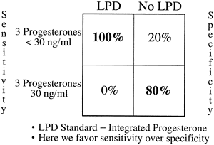 The original definition of LPD presented by Jones in 19491 was a corpus luteum defective in progesterone secretion, which in turn was a cause of infertility or early spontaneous abortion. Further investigation led to a broadening of this definition to include a short luteal phase interval (<12 days between ovulation and menses) with relatively normal progesterone concentrations, a normal-length luteal phase with inadequate progesterone production, or inadequate endometrial response to otherwise normal progesterone concentrations.2 Because of the possibility of sporadic abnormalities of luteal function in otherwise fertile women, most experts agree that the diagnosis of LPD can be made only after repeated testing. LPD is relevant in the clinical setting only if it is present in most menstrual cycles in a patient. The requirement for two consecutive menstrual cycles, as currently applied to the diagnosis of LPD, is arbitrary. |