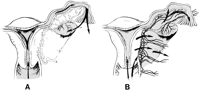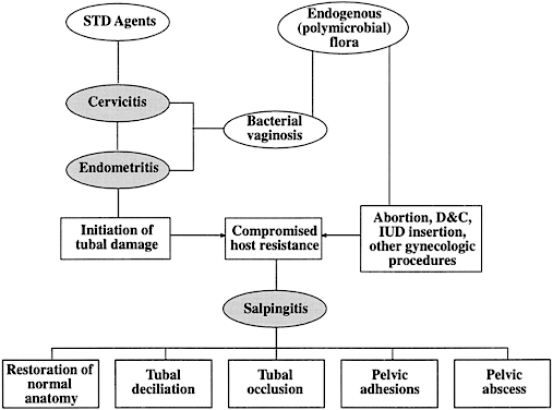 *Endocervical samples obtained at the time of oocyte aspiration were assayed for IgA antibodies to C. trachomatis by ELISA (Savyon Diagnostics). Adapted from Witkin et al. Unsuspected Chlamydia trachomatis infection and in vitro fertilization outcome. Am J Obstet Gynecol 171:1208, 1994. NONGONOCOCCAL-NONCHLAMYDIAL INFECTION. Nongonococcal-nonchlamydial salpingitis may also arise de novo as a primary infection. Approximately 25% of women with PID have a nongonococcal-nonchlamydial cause.65 Patients with nongonococcal PID have the onset of pain distributed evenly throughout the cycle and less frequently associated with menses. There is less fever, vaginal discharge, and liver tenderness than with gonococcal PID. Despite these differences, the clinical presentation does not adequately distinguish between the two, and reliance on culture is necessary. Except for the presence of N. gonorrhoeae or C. trachomatis, no difference in vaginal or cervical flora exists between patients with gonococcal or chlamydial and nongonococcal-nonchlamydial salpingitis. As shown in Table 1, the cervix and vagina of healthy women contain an abundance of aerobic and anaerobic microorganisms. There may be a critical number of organisms needed to overwhelm local host defense mechanisms in the cervix, allowing an infection to ascend to the upper genital tract. There is probably a continuum from bacterial vaginosis to endometritis and salpingitis, because women with bacterial vaginosis are significantly more likely to be diagnosed with PID.10 The substantial isolation rate of bacteria other than gonococci or C. trachomatis from tubal fluid of these PID patients has shown that bacterial vaginosis organisms can cause acute salpingitis without antecedent chlamydial or gonococcal infection.66 Peritoneal or tubal cultures have yielded a mixed aerobic and anaerobic flora in 35% to 50% of patients, anaerobes alone in 15%, and aerobes alone in approximately 30% to 40% of patients. Between 4% and 17% of women with PID have had M. hominis, and 2% to 20%, have had U. urealyticum recovered from the fallopian tubes.66 Genital mycoplasmas probably play an infrequent role in PID, based on isolation rates, serologic data, and the observation that they produce little or no damage in human oviductal tissue cultures.67 PREDISPOSING FACTORS. Previous gonorrhea, use of an IUD, frequent douching, and uterine instrumentation predispose to the development of nongonococcal PID.68 It is possible that unrecognized tubal damage impairs normal defense mechanisms even in the absence of clinically overt PID. When patients who have had PID subsequently acquire gonorrhea, more than one third develop acute onset PID, in contrast to the 10% to 17% rate in general.3 The use of an IUD is associated with approximately a threefold to fivefold increased risk of PID, which appears to exist for as long as the IUD is in place.21 The IUD may be a greater risk factor in nongonococcal than in gonococcal PID and is associated with an increased frequency of adnexal masses.21 Several reports have indicated the possible association between pelvic infection caused by Actinomyces israelii, an anaerobic gram-positive bacterium, and the use of an IUD.69 The use of any type of tail in an IUD provides a potential route for infection to the uterine cavity. Oral contraceptives may decrease the risk of developing PID, although they have less protective effect than barrier contraceptives. It is logical that women who have used IUDs suffer more tubal infertility and that women who used oral contraceptives have less infertility than women who have used neither method.21,70 Hysterosalpingography is commonly used in a complete infertility investigation. The introduction of water-soluble contrast media has eliminated the complications of oil embolism and has reduced the risk of granuloma formation, but inflammatory reactions continue to be serious complications of this procedure. The frequency of serious infection after hysterosalpingography varies from 0.3% to 3.1% of patients.71 It is possible that these episodes are caused by reactivation of preexisting disease rather than a de novo infection. High-risk patients for post-hysterosalpingography infections include those with prior pelvic infection or prior adnexal tenderness, a mass, or dilated fallopian tubes. Antibiotic prophylaxis with doxycycline (100 mg twice daily for a total of 7 days) reduces the incidence of post-hysterosalpingography infections.72 Pathogenesis The pathways of spread of genital tract infections are shown in Figure 2. In gonococcal and chlamydial salpingitis, the microorganisms ascend by surface extension from the lower genital tract through the cervical canal by way of the endometrium to the fallopian tubes (Fig. 2A). Microscopically, the endosalpinx is inflamed and edematous. There can be adhesion of the mucosal folds, destruction of cilia, occlusion of the infundibulum, and production of a pyosalpinx. The gonococcal infection may spread beyond the endosalpinx, with possible focal abscess formation and perisalpingitis. In some cases of nongonococcal salpingitis, particularly with M. hominis,73 the pathogens may enter through lesions in the cervix or endometrium and spread to the parametria and tubes through lymphatics and blood vessels (Fig. 2B). The inflammatory swelling that affects the parametria and the tubes is more pronounced than in gonococcal salpingitis, but the endosalpinx is usually intact. The sequelae of PID that are responsible for infertility include chronic interstitial salpingitis, hydrosalpinx, salpingitis isthmica nodosa, and periadnexal adhesions. Infertility may also occur because of abnormal secretory, ciliary, and peristaltic function of the fallopian tube. The postulated interrelationships of STDs and endogenous organisms in the pathogenesis of tubal infertility secondary to PID are depicted in Figure 3.74 Therapeutic Considerations Early recognition and proper treatment of upper 