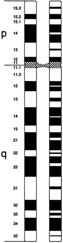 In 1970, Caspersson and colleagues4 described a fluorescent staining technique that produced patterns of horizontal bands (Q bands, named after the compound quinacrine) that distinguished each of the 22 pairs of autosome chromosomes and the X and Y chromosomes. This development was a major advancement in the field of cytogenetics. Previously established chromosome syndromes were confirmed. More refined analysis of chromosome rearrangements was possible because the resolving power for detection of chromosome aberrations was greatly enhanced. New chromosome syndromes were identified. Cancer cytogenetics progressed rapidly, leading to the identification of chromosome aberrations associated with specific hemopoietic malignancies. Assigning of genes to specific chromosome sites (gene mapping) became possible. Several other banding techniques were developed shortly afterward that did not require the use of a fluorescent microscope.5,6 These included trypsin digest of chromosomes followed by Giemsa staining (G banding), currently the most widely used of banding techniques (Fig. 2);7 and, R banding,8 in which exposure to salts solutions at high temperature produces a banding pattern that is opposite that of Q banding and G banding. For example, where Q banding shows bright fluorescence and G banding dark bands, R bands are light, and where Q banding shows dull fluorescence and G banding light bands, R bands are dark. Additional techniques have also been developed with special qualities to identify unique-appearing chromosomes. For example, C banding9 delineates each chromosome in regard to the location and number of centromeric regions. Silver staining,10 together with Q-band profiles, identifies the parental origin and the stage of meiotic nondisjunction in human trisomies of acrocentric chromosomes.