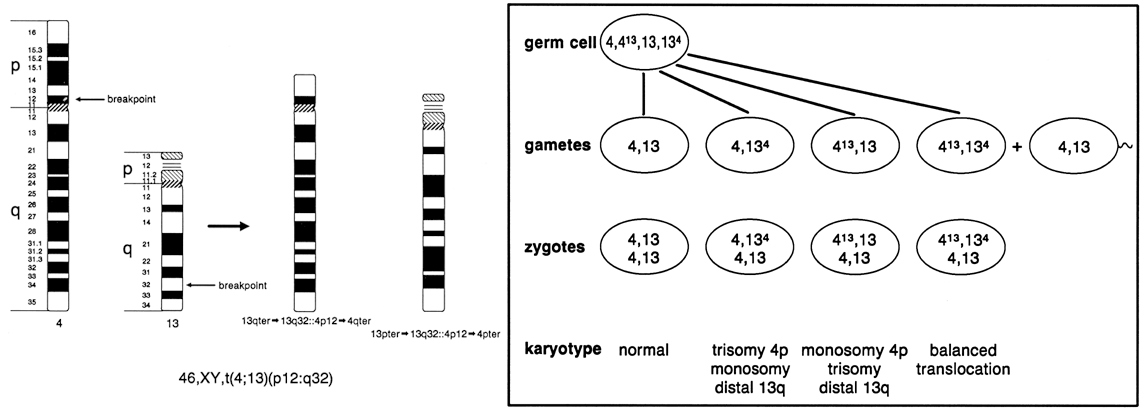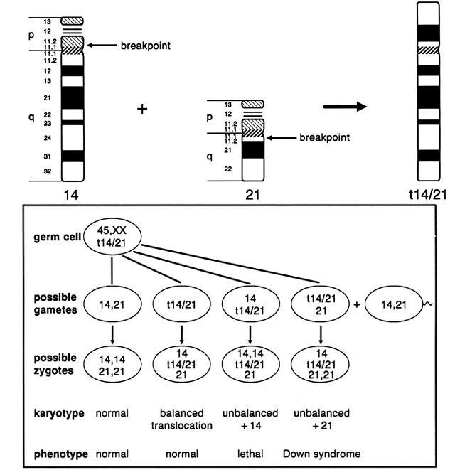 A de novo, apparently balanced translocation detected in the course of prenatal genetic diagnostic studies cannot ensure a normal phenotypic outcome. Balanced translocations have been observed in liveborn infants with congenital malformations and developmental disabilities whose parental chromosomes are normal. A survey of centers performing prenatal diagnosis showed that the risk of an adverse pregnancy outcome with a de novo translocation detected by second-trimester amniocentesis was high, exceeding 9%.41 Although the specific risk of mental retardation and birth defects cannot be predicted with certainty, empirical data indicate that 1 of 10 sporadic, apparently balanced translocations may be associated with loss of normal gene function and abnormal embryonic development. The recurrence risk (i.e. the chance of a second conception with the same chromosome rearrangement) is low, although rare instances of gonadal mosaicism for structural aberrations have been observed. Prenatal diagnostic studies in subsequent pregnancies are warranted in cases of de novo translocations, despite the low risk of recurrence. Centric fusion, or a Robertsonian translocation, results as a consequence of chromosome breakage at or near the centromeres of two acrocentric chromosomes (13, 14, 15, 21, and 22). The breaks usually occur just above the centromeres, resulting in a single metacentric chromosome with two centromeres (i.e. dicentric) and a satellite fragment with no centromere (i.e. acentric). Any acentric fragment invariably is lost during cell division. Alternatively, Robertsonian translocations may arise in some cases as a consequence of crossing over between homologous segments of two acrocentric chromosomes during meiosis I. In either case, the formation of a Robertsonian translocation is associated with reduction of chromosome number by one, with the diploid number being 2N = 45. The genetic material contained on the short arms of acrocentric chromosomes appears to have no clinical effects. Despite their loss, individuals who carry de novo Robertsonian translocations are phenotypically normal. There is, however, an increased reproductive risk of forming unbalanced gametes during gametogenesis. Centric fusion of chromosomes 13 and 14 is the most common structural chromosome aberration in humans, occurring with a frequency of 1 in 1000 individuals.1 The next most common Robertsonian translocation involves chromosome 21 with chromosomes 13, 14, 15, 21, and 22. As shown in Figure 10, a balanced carrier of a 14;21 centric fusion translocation has 45 chromosomes and, although healthy, is at significant reproductive risk. When homologous chromosome segments synapse during meiosis, a trivalent is formed of the two normal chromosomes, 14 and 21, with the 14;21 translocation chromosome. At anaphase I, the three chromosomes can segregate in three ways, producing gametes of six different constitutions. Alternate segregation is associated with one chromosomally normal gamete and one balanced gamete. Adjacent I segregation results in one gamete carrying a duplicated segment of chromosome 14 and one deficient in the same segment; because both are unbalanced, embryonic and/or fetal viability are likely to be compromised, and spontaneous abortion is likely. Adjacent II segregation produces one gamete with duplication of the long arm of chromosome 21 and one gamete with complete deficiency of chromosome 21. Although liveborn infants with only one 21 chromosome (from the other parent) has not been observed, the gamete with duplication of the long arm of 21 results in a conception with Down syndrome. Although six different gametic combinations are theoretically possible, only three types of conceptions are observed: conceptions with a normal complement of 46 chromosomes; a balanced 14;21 translocation carrier with 45 chromosomes and a normal pregnancy outcome expected; and an unbalanced chromosome constitution because of the presence of the 14;21 translocation and two chromosomes 21, resulting in Down syndrome. These three types of conceptions do not occur with equal frequency in the liveborn population, partly because of selection factors favoring the gametes carrying the 14;21 translocation and partly because of the sex of the carrier parent. Empiric data obtained in familial forms of 14;21 translocations indicate that approximately 20% of pregnancies end in spontaneous abortion; as many as 50% of all liveborn infants are translocation carriers like one of the parents. If the maternal parent is the carrier, the risk of a Down syndrome liveborn infant is 11%, whereas if the paternal parent is the carrier, the risk of Down syndrome is less than 5%42 (Table 2).