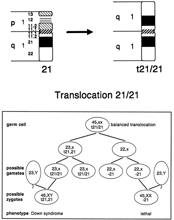 In approximately 4.5% of all newborn cases, Down syndrome occurs as a consequence of an unbalanced Robertsonian translocation involving chromosome 21. Chromosome studies in such newborns, however, show that only one half of the cases are familial. The remaining cases arise de novo in the meiotic cell division producing the gamete that participated in fertilization. Down syndrome as a consequence of a Robertsonian 21;21 translocation presents a unique situation. In approximately 95% of cases, the 21;21 translocation observed in a newborn with Down syndrome has arisen de novo. The remaining cases most likely are caused by gonadal mosaicism, because the origin of a balanced carrier for a 21;21 Robertsonian translocation would require two biologic errors (formation of the translocation in one parental gamete and loss of a normal chromosome 21 in the other parental gamete). If centric fusion of the two 21 chromosomes occurred during gametogenesis, the resulting conception could not be balanced but rather would be affected with Down syndrome because of the normal chromosome contributed by the other parent's gamete. If centric fusion of the two 21 chromosomes occurred postzygotically, presumably there would be cells with 46 chromosomes and cells with 45 chromosomes carrying the translocation, with one unlikely exception: formation occurring before the first cell division of the zygote. What is unique to carriers of 21;21 translocations is that all of their gametes result in chromosomally unbalanced conceptions (Fig. 11). Approximately one half of the conceptions are affected with Down syndrome, based on the contribution of the 21;21 translocation from one parent and a normal 21 chromosome from the other parent. The chromosome constitution of the remaining conceptions has only one chromosome 21 (monosomy 21), and will not be viable. If all of the cells of a potential parent carry the 21;21 translocation in a balanced state, prenatal diagnosis would be of no value, because all pregnancies are chromosomally unbalanced and developmentally compromised. When Down syndrome occurred secondary to a Robertsonian 21;21 translocation and parental karyotypes were normal, there were no recurrences of Down syndrome.43