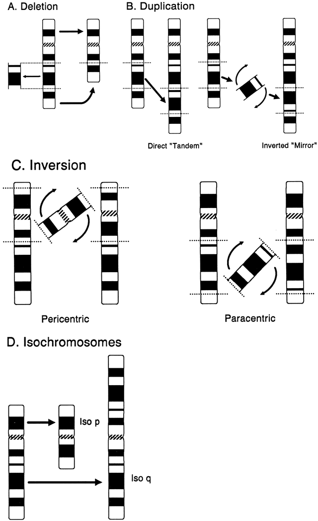 DELETION. A deletion is the loss of any part of a chromosome. It can occur in several ways. A terminal deletion occurs when a single break in a chromosome produces centric and acentric chromosomes. The latter chromosome, lacking a centromere, is lost in the next cell generation, whereas when the centric chromosome duplicates, the broken ends of the chromatids can fuse together, forming a dicentric chromosome. More commonly, an interstitial deletion arises from the breakage at two points along a chromosome (Fig. 12A). If the chromosome segment between the two sites of breakage does not include the centromere, the acentric fragment so formed will be lost. If breakage occurs in both chromosome arms, the terminal, acentric ends are lost, and the two proximal ends may unite to form a ring chromosome. A ring chromosome with a centromere is usually able to complete mitosis successfully, although if sister-strand crossing over occurs, a ring chromosome that is twice the size of the original ring chromosome, with two centromeres, is formed. Deletion of segments of chromosomes can occur as a consequence of adjacent I and II disjunction involving a parental translocation.