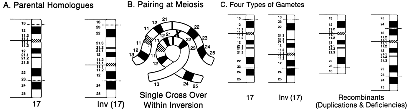 The smallest loss of chromosomal material detected microscopically is approximately 400,000 base pairs.1 Conceptions with visible deletions can be monosomic for a large number of genes. With autosomal deletions that are viable, developmental disabilities with mental retardation are to be expected. Specific syndromes associated with deletions include the cri-du-chat syndrome with visible loss of genetic material from the short arm of chromosome 5; the Wolf-Hirschhorn syndrome with deletion in the short arm of chromosome 4; and the Prader-Willi syndrome, with paternally derived deletion of 15q11. Part of a group of syndromes designated as contiguous gene syndromes44 includes conditions that occasionally have been associated with small but cytogenetically detectable deletions or duplications. Included in this group are deletions of 8q24 in Langer-Giedion syndrome,45 deletions of 11p13 associated with aniridia and Wilms tumor,46 deletions of 13q14 associated with retinoblastoma,47 deletions of 17p13 in the Miller-Dieker syndrome,48 and deletions of 22q11 in DiGeorge syndrome.49 When cytogenetic analysis does not show a visible deletion, molecular analysis can demonstrate the loss of specific gene sequences representing submicroscopic deletions of the band or bands previously associated with the specific syndrome. The ability to apply molecular techniques for the cloning of the gene responsible for Duchenne and Becker muscular dystrophies, for example, first required determining its physical location, which was accomplished through deletion mapping.50 DUPLICATION. Duplication of any segment of a chromosome may arise as the result of unequal crossing over during meiosis or from meiotic events in a parent with a translocation, inversion, or isochromosome (Fig. 12B). In general, duplications as a form of chromosomal imbalance appear to be better tolerated clinically than deletions. At the molecular level, duplications in the form of repeats of specific nucleotide sequences appear to play a primary role in such gene disorders as the fragile-X syndrome, myotonic dystrophy, and the Kennedy syndrome and may be an important feature in many other human genes.51 For example, the fragile-X syndrome is caused by a heritable unstable DNA sequence because of changes in copy number of a trinucleotide repeat, CGG.52 The overall incidence of visible deletions, duplications, or a combination of the two in newborns is estimated at 1 case 1 per 2000.53 For any chromosomal duplication or deletion detected prenatally or postnatally, parental chromosomes must be examined to exclude a balanced structural rearrangement. If parental karyotypes are normal, the recurrence risk is not increased above the general population incidence, with the rare exception of gonadal mosaicism. INVERSION. Inversions arise from two chromosome breaks occurring in the same chromosome, followed by a rotation of 180 degrees of the segment between the breaks (Fig. 12C). If both breaks occur in the same arm so that the centromere is not included, the inversion is called paracentric. If the breaks are on either side of the centromere, the inversion is called pericentric. The change in gene order has not been associated with any clinical abnormalities, but inversions place their carriers at reproductive risk as a consequence of their structure and behavior during meiosis. Inversions may interfere with the pairing of homologous chromosomes and thereby reduce crossing over within the inverted segment, but for synapsis to occur, one member must form a loop in the region of the inversion (Fig. 13A). If crossing over occurs within the loop of a paracentric inversion, a dicentric chromatid and an acentric fragment are formed, both of which are unstable and unlikely to result in abnormal offspring. If a single crossover occurs within the loop of a pericentric inversion, the resulting two chromatids have complementing deletions and duplications, and abnormal offspring may result (Fig. 13B). The closer both breakpoints are to the ends of the chromosomes, the greater is the chance that the pregnancy will come to term. Paracentric inversions are not an indication for prenatal diagnosis, because if crossing over does occur within the inversion loop, the degree of genetic imbalance is incompatible with viability in all but the most exceptional instances. Carriers of pericentric inversions, however, are at risk for viable, chromosomally unbalanced offspring, especially when a large inversion is involved. Empirically, this risk is 8% for maternal carriers and 4% for paternal carriers53 (Table 2). One exception is worthy of mention: small pericentric inversions of chromosome 9. These common inversions, which are present in 1% of the general population, have not been associated with abnormal offspring as a consequence of crossing over within the inverted segment. ISOCHROMOSOME. An isochromosome is a structurally altered chromosome in which there is deletion of one entire arm and complete duplication of the other arm (Fig. 12D). This type of chromosomal aberration most commonly arises by misdivision of the centromere in the transverse direction. Another mechanism involves the simultaneous breakage of both chromatids (i.e. isochromatid breakage), followed by fusion of the centromeric portions and resulting in a dicentric chromosome. When the isochromosome is dicentric, one centromere apparently becomes nonfunctional so that the isochromosome routinely segregates normally during cell division. Isochromosomes for the long arms of the X and Y chromosomes have been observed in liveborn infants, whereas for other chromosomes, an isochromosome usually leads to an early spontaneous abortion, with two rare exceptions—isochromosomes for the short arms of chromosomes 9 and 12.1 Special Characteristics of the X and Y Chromosomes The X and Y chromosomes exhibit certain unique biologic properties that are clinically relevant to the practice of obstetrics and gynecology. X IN