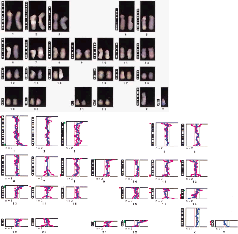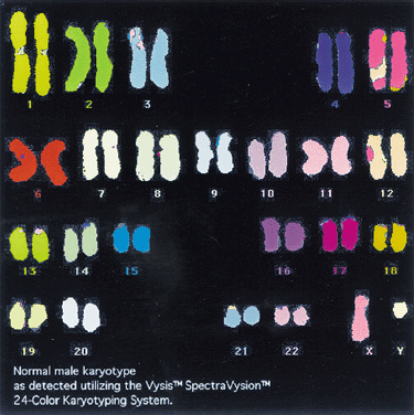 A routine cytogenetic analysis involves evaluating 15 to 20 cells to determine their modal chromosome number and assessing the structural integrity of each chromosome in the complement. The modal chromosome number can be determined by counting chromosomes through the microscope. Identification of an extra or missing chromosome is possible by microscopic examination, and the finding is confirmed through the preparation of a set of karyotypes. A karyotype is a photographic or computer-generated representation of the chromosomes in a cell arranged according to size, centromeric position, and banding pattern. Assessment of the structural integrity of each chromosome in the complement can also be made through the microscope, and gross structural chromosome aberrations can be detected as well. However, a set of two or more karyotypes always must be prepared. Cells with well-prepared chromosomes that exhibit a total of 350 to 400 bands in the complement are considered an essential part of any routine cytogenetic analysis (Fig. 2). A standard chromosome analysis, therefore, requires that the final interpretation be based on a chromosome count of at least 15 to 20 cells, the preparation and careful evaluation of two to three karyotypes consisting of well-banded chromosomes, and the exclusion of any structural chromosome aberrations. Subtle chromosome aberrations, such as the gain or loss of a single band, usually are detected as the result of a detailed analysis of the banding pattern of chromosomes magnified thousands of times by means of photographic or computer processing. In this way, homologous chromosomes can be examined meticulously and compared for small but clinically significant structural differences. The number of cells analyzed varies according to the reason for referral, the initial cytogenetic findings, the protocol of each laboratory, and the quality of the chromosome morphology. If an abnormal chromosomal complement is present in all of the cells of a specimen, analysis of a small number of cells10,11,12 may be sufficient for diagnostic purposes. The presence of a single cell with a chromosome aberration usually is attributed to an error in cell division during tissue culture or a technical artifact arising in the course of harvesting. In most cases, the parents are informed that such a finding is not associated with anomalous fetal development. Nevertheless, the presence of an abnormal cell may necessitate analyzing 20 to 50 or more cells to distinguish between true mosaicism, which could be responsible for fetal maldevelopment, and pseudomosaicism (false mosaicism) caused by technical artifact or an in vitro error. True chromosome mosaicism occurs when there is a mixture of chromosomally normal and abnormal cells. True mosaicism may be particularly difficult to detect if present in low frequency. Most cytogenetic analyses are statistically based on an evaluation of a minimum of 15 to 20 cells to reduce the chance to less than 5% probability that true mosaicism will not be detected. A counseling dilemma arises when chromosome mosaicism is observed after chorionic villus sampling or amniocentesis: does the mosaicism detected in the villi or cultured amniotic fluid cells represent the chromosome complement of the fetus? Confirmation of chromosome mosaicism may require additional invasive procedures, such as percutaneous umbilical blood sampling (PUBS), which would place the patient at additional obstetric risk. Even attempts at confirmation of chromosome mosaicism may fail. For example, mosaicism for chromosome 5 present in cultured amniotic fluid cells, followed by normal chromosome analysis of fetal blood obtained by PUBS, still resulted in a child with developmental disabilities because the mosaicism was confined to the skin and was not present in blood cells.17 |