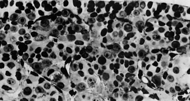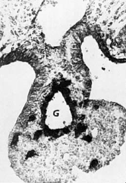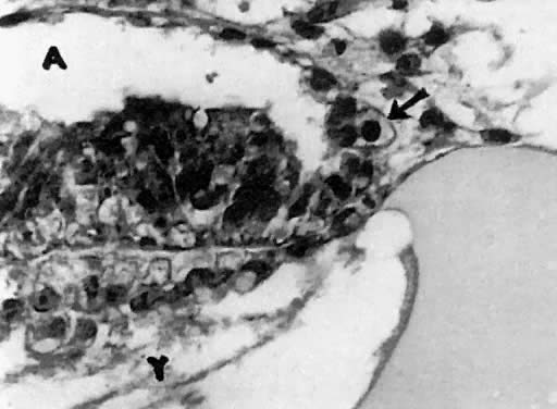 The indifferent primordia of gonads are longitudinal streaks of cellular tissue known as the genital ridges. They are present on the medioventral surface of the urogenital ridges in embryos 35 to 42 days old (7 to 12 mm crown rump length [CRL]). After the genital ridges become evident, the original urogenital ridges are called the mesonephric ridges. The blastema of each genital ridge consists of primordial germ cells (PGCs), mesoblastic (coelomic) cells, and mesenchymal fibroblasts. Primordial Germ Cells All gametes, testicular as well as ovarian, are derived from PGCs. Determination of germ cells occurs early in development, within the inner cell mass of the blastocyst. Stewart and Mintz33 injected cells of mouse embryonal carcinoma cultivated in vitro into mouse blastocysts and observed their differentiation into germ cells. This proves that early somatic cells are converted into germ cells. Hertig and associates34 claimed that one of the cells of the eight-cell inner cell mass of a human 4.5-day-old blastocyst might be a germ cell. Jirásek (unpublished data) found a group of several PGCs in the ectoblast adjacent caudally to the ectoblast of the germ disc of the bilaminar embryo with the primary yolk sac (Fig. 1).