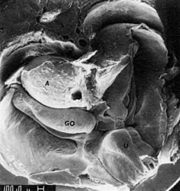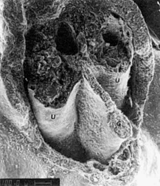 Female Transformation of Paramesonephric Ducts Each paramesonephric duct may be divided into an upper and lower portion. The upper portion develops into the ovarian tube, and the lower portions of both ducts fuse during the ninth week into a single uterovaginal canal (see Fig. 19). The uterovaginal canal is composed of a uterine and a vaginal segment. In the uterine segment, the mesenchyme accompanying the mesonephric ducts fuses with the mesenchyme of the paramesonephric ducts and gives rise to the uterine wall, mainly myometrium; at the same time, the epithelium of the paramesonephric ducts contributes the surface lining and epithelium of the glands. The vaginal segment of the uterovaginal canal contacts the endodermal epithelium of the urogenital sinus in the area of the müllerian tubercle. Paired endodermal outgrowth (sinovaginal bulbs) enfold the tip of the uterovaginal canal, and multilayered epithelium develops around the cylindrical paramesonephric epithelium of the vaginal segment of the uterovaginal canal, resulting in the formation of the vaginal plate. As multilayered epithelium expands around the lower end of the uterine mesenchymal condensation, vaginal fornices are formed, and the simple paramesonephric mesodermal cylindrical epithelium located centrally in the vaginal plate degenerates. The vaginal lumen is formed by a dehiscence of the central layers of the multilayered epithelium of the vaginal plate. The proximal four fifths of the vagina is formed around the vaginal portion of the uterovaginal canal; the caudal fifth arises entirely from the endodermal sinovaginal bulbs. In some areas where the cylindrical epithelium of the uterovaginal canal is not incorporated into the vaginal plate and remains at its periphery, persistent islands of cylindrical ( müllerian) epithelium may give rise to vaginal adenosis. Mesenchymal remnants of the müllerian tubercle located between the vagina and the urogenital sinus contribute to the hymen. Regression of Paramesonephric Ducts in Males In males, the central paramesonephric ducts degenerate, leaving only remnants of their cranial and caudal ends. The regression of each paramesonephric duct is closely related to the development of the ipsilateral testis. The decisive factor in this process ( müllerian inhibiting factor [MIH]) is produced by embryonal Sertoli cells and seems to be related to a substance rich in glucosaminoglycans that fills the interstitial spaces of the embryonal testes.42 The testicular glucosaminoglycans with MIH diffuse along the caudal gonadal ligament, which crosses the paramesonephric and mesonephric ducts. The epithelial cells of the paramesonephric ducts, exposed to MIH and testicular glucosaminoglycans, swell and rupture, and consequently liberated acid hydrolases destroy the ductal cells. Once initiated, the regression of the paramesonephric ducts extends cranially as well as caudally. The cystic cranial portion of the paramesonephric duct, corresponding to the infundibulum of the oviduct, changes into the testicular appendix (hydatid of Morgagni). The caudal portions of the uterovaginal canal remain preserved within the prostate as the prostatic utriculus. |