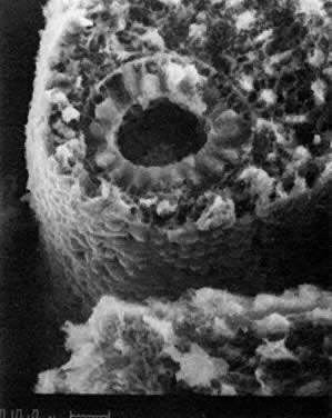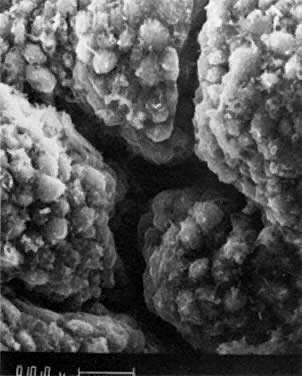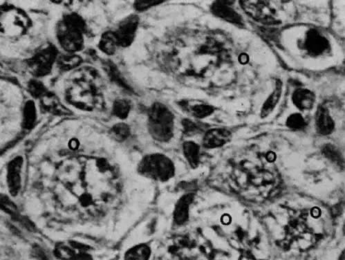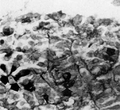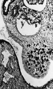 The morphogenic sequence of ovarian development is divided into two basic periods: prefollicular and follicular. The prefollicular period precedes differentiation of primary isolated ovarian follicles and includes mitotic proliferation of oocytes and their entrance into the meiotic prophase. The follicular period is related to the interruption of meiosis I, after termination of the prophase, and to the differentiation of isolated ovarian follicles with a distinct granulosa layer. The first phase does not require the presence of two X chromosomes (as observed also in 45,X fetuses).43 The prefollicular phase of ovarian development has two stages: the embryonal ovary and the early fetal ovary. Embryonal Ovary The embryonal ovary40 is present in embryos of 18- to 40-mm CRL and is characterized by mitotic proliferation of germ cells (oogonia) within the genital ridges. Simultaneously, the blastema of the indifferent gonad differentiates into epithelial cords and interstitium (Fig. 10). The interstitium contains desmogenic fibroblasts, the cords that form the rete adjacent to the mesonephros, and medullary cords, which are incompletely separated from the surface epithelium. Medullary cords contain undifferentiated supportive cells and oogonia. The PGCs located in contact with and under the surface epithelium undergo an intensive mitotic proliferation, resulting in the formation of cortical cords composed almost exclusively of oogonia. Embryonal ovaries are characterized by intensive mitotic proliferation of oogonia, which do not interact with other cells. The ovarian cords result from differentiation of the connective tissue. By definition, no meiotic activity occurs in the embryonal ovary. The mitotic wave of oogonia exhausts their entire mitotic capacity during fetal development. Early Fetal Ovary At the beginning of meiosis I, meiotic oocytes appear in the medullary cords and the deepest portions of the cortical cords in fetuses of about 40 mm CRL (end of week 10). Oocytes entering the meiotic phase form clones and are interconnected by cytoplasmic bridges. All interconnected oocytes are at the same stage of meiotic prophase (Fig. 11). Leptotene, zygotene, and pachytene oocytes are present by week 11; diplotene oocytes appear a week later.