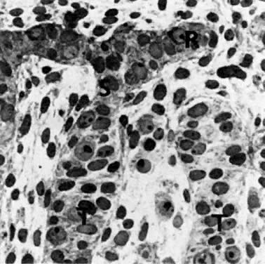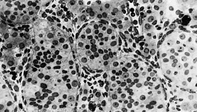 Embryonal Testis (SRY-Related Morphogenic Cascade of Primary Testicular Development) The first stage is mitotic regulation of PGCs. In 46,XY embryos 42 to 45 days old ( Jirásek stage 7–5), PGCs interact with adjacent coelomic cells (cell-to-cell interaction). PGCs temporarily lose glycogen, alkaline phosphatase, and their round shape and join the undifferentiated supportive cells.38,39 The consequence of this interaction is lifelong mitotic proliferation of germ cells (spermatogonia). Mitotic regulation of germ cells precedes differentiation of supportive cells into embryonal Sertoli cells (Fig. 7). The second stage, differentiation of Sertoli cells, includes transformation of steroidogenic small round mesenchymal cells with spheric nuclei into cylindrical embryonal Sertoli cells with elongated nuclei exhibiting differentiation of an apical (supranuclear) domain and a basolateral domain. Differentiation of the supranuclear zone is characterized by the presence of acid phosphatase. Differentiation of the basolateral domains of Sertoli cells is related to the aggregation of Sertoli cells into testicular cords. PGCs (spermatogonia) are incorporated into cords regardless of Sertoli cell differentiation. The character of the cords depends on the surrounding mesenchyme: the portions of the testicular cords located within the gonadal blastema give rise to the seminiferous cords, and the portions adjacent to the mesonephros, located within the mesonephric mesenchyme, give rise to the cords of the rete testis (Fig. 8). Embryonal Sertoli cells produce AMH.14,15 The barrier between the germinal testicular compartment and the extracellular compartment of the interstitium is formed by the specific membranes under the testicular cords. These membranes are contributed both by Sertoli cells and by the mesenchymal desmogenic cells of the interstitium. The interstitium of the embryonal testis (days 45 to 56 after conception) contains a mixture of desmogenic fibroblasts and undifferentiated steroidogenic progenitor cells that do not produce any androgens. The interstitium is filled with glucosaminoglycans synthesized under the influence of AMH. The glucosaminoglycans are related to the regression of the müllerian ducts.40 At the end of embryonal period, desmogenic fibroblasts concentrate under the surface epithelium and contribute the primordium of the tunica albuginea. Fetal Testis The stage of fetal testis is characterized by the presence of interstitial Leydig cells (Fig. 9), which produce androgenic steroids, predominantly testosterone. Steroidogenesis is controlled by the genes of steroid conversion.