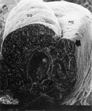 In females, both the epigenital and the paragenital nephrons transform into the irregular tubules of the epo-ophoron and paro-ophoron. Growth of the mesonephric ducts and of the epigenital mesonephric tubules is testosterone-dependent. In males, in the presence of testosterone and its receptors in target tissues, the mesonephric ducts give rise to the ductus epididymis, ductus deferens, and ductus ejaculatorius. The vesicular glands are formed as evaginations from the terminal portion of the mesonephric ducts. In the absence of testosterone, the mesonephric ducts disintegrate. The persisting remnants of the cranial portion of the mesonephric ducts in males are known as the appendix of the epididymis or, in females, the appendix of the ovary. Remnants of the mesonephric ducts present in females within the plica lata or along the vaginal wall (sometimes reaching the vaginal vestibule) are known as Gartner's canals (ducts). Paramesonephric (Müllerian) Ducts The paramesonephric ducts originate in 13- to 15-mm embryos (44 to 48 days after conception) as invaginations lined by coelomic cells of the gonadal surface epithelium, growing from the upper pole of the genital ridge to the mesonephric ridge (Fig. 15). This epithelium invaginates lateral to the superior blind end of the mesonephric duct, located in the regressing mesonephric ridge.47 The invaginating cellular cord of the paramesonephric duct grows caudally in contact with the mesonephric duct, using the latter duct as a guiding structure.46,48 The paramesonephric ducts cross the mesonephric ducts ventrally (Fig. 16), approach near the midline, and run parallel to the urogenital sinus. Luminization of the paramesonephric ducts proceeds craniocaudally. Cranially, the ducts open into the peritoneal cavity near the cranial poles of the gonads (Fig. 17 and Fig. 18). Caudally, the blind ends of both ducts contact the endoderm of the urogenital sinus (without breaking through) between the openings of the mesonephric ducts in the elevated area known as the müllerian tubercle. Parallel segments of both paramesonephric ducts are separated temporarily by a septum. As the septum disintegrates, the caudal portions of both paramesonephric ducts fuse into a single uterovaginal canal (during weeks 9 to 10 after conception) (Fig. 19).