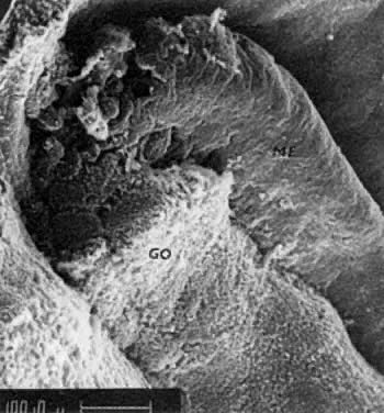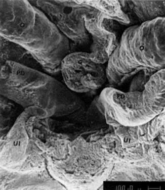 Simultaneously, as the “oldest” oocytes enter meiosis, the “young” oogonia underneath the surface epithelium continue mitotic proliferation. In early fetal ovaries, there are no primary isolated follicles with a complete granulosa layer and connective tissue envelope. In fetuses affected by X-chromosome monosomy, normal ovarian development proceeds until this early fetal stage. The second phase—the follicular phase—of ovarian development is related to the interruption of meiosis I after the prophase has been completed, and to the differentiation of isolated primary follicles. During the phase of follicular differentiation, the stages of late fetal ovary and perinatal ovary are distinguished. Late Fetal Ovary After the oocytes reach the diplotene stage of the first meiotic prophase, connective tissue invades groups of meiotic oocytes, and at the same time granulosa cells—steroidogenic progenitors of coelomic origin—spread over the surface of the oocyte and contribute an epithelial granulosa layer around the oocyte (Fig. 12). At this stage, the granulosa cells interact with the oocyte and interrupt the meiosis. The nuclei of oocytes return to an interphase state. If the proliferation of granulosa cells is inadequate, oocytes come into direct contact with the connective tissue and undergo degeneration (atresia). Although the primary isolated follicles differentiate in the deepest portions of the medullary and cortical oocytes (the “oldest” oocytes), the superficially located oogonia continue mitotic division, differentiate into oocytes, and enter the meiotic prophase. There are no steroid-producing cells around primary ovarian follicles. The interval between the end of the first meiotic prophase and metaphase lasts until ovulation of the follicle, occurring throughout the reproductive years (i.e., 12 to 50 years of age). The formation of complete follicles requires the presence of at least two X chromosomes. In late fetal ovaries, the number of oocytes44 is estimated to be 6 million; at birth, about 2 million oocytes are present, incorporated into follicles. Both ovaries of a 20-year-old woman are thought to contain 400,000 oocytes. Of these, only about 400 are ovulated during the entire reproductive period of a woman. The formation of follicles within late fetal ovaries in the presence of two X chromosomes represents a rescue operation, breaking meiosis I and saving some oocytes before termination of meiosis and consequent degeneration for a maximum of 50 to 60 years. In normal fetal ovaries, only 30% of the oocytes that are formed reach the stage of primary follicles. Perinatal Ovary The growth and cavitation of the follicles are characteristic aspects of the perinatal ovary. All stages of folliculogenesis are present in perinatal ovaries during the second postnatal month: primary resting follicles with flat granulosa cells, primary growing follicles with cylindrical granulosa cells, compact growing follicles with a multilayered granulosa, and vesicular (cavitated) follicles. Epithelioid thecal cells containing the 3β-hydroxysteroid dehydrogenase first appear in perinatal ovaries around follicles with a multilayered granulosa at the stage of beginning cavitation beneath the cumulus—oocyte complex. Follicular cavitation occurs in newborns after separation from the placenta. Drafting of oocytes begins in the perinatal ovaries. As the production of hypophyseal gonadotropins is discontinued, shortly after birth, the perinatal ovary changes during the first postnatal year into the inactive or prepubertal ovary of a child. During childhood, follicular drafting continues, and the drafted follicles (in the absence of gonadotropins) develop to the stage of cavitated follicles. There are, however, no thecal cells around the growing follicle. The absence of thecal cells is a characteristic feature of the ovaries of a child. During puberty, the ovary gradually begins to produce steroids under the influence of FSH and LH. In addition to drafting, in the adult ovaries oocytes grow and are selected, and some are ovulated. Ovulated follicles change into the corpora lutea. As the follicles become exhausted, the adult ovary changes into a menopausal ovary completely deprived of follicles (at the age of 50 to 60 years). Differences Between Male and Female Gonadal Development The most important difference between males and females is that there is lifelong proliferation of spermatogonia, but the proliferation of oogonia is limited to a short prenatal period. The analysis of morphogenesis suggests that the early differentiation of PGCs, which are not incorporated into germ layers, inhibits almost all their genes related to differentiation. The basic programming of germ cells is related to their migration into gonads and to a programmed number of mitoses followed by meioses. If there is one germ cell in the eight-cell inner cell mass of the blastocyst, and if the population of germ cells reaching the genital ridges is about 1,000, there are about 11 mitotic generations of PGCs. Within the ovaries, if the population of oocytes is around 5 million, there are an additional 12 to 14 generations of oogonia. The entire mitotic capacity of the oogonia is exhausted by this mitotic division; thereafter, germ cells undergo terminal differentiation into oocytes, which enter meiosis. The prophase of meiosis I prenatally creates a unique combination of genes from the paternal and maternal chromosomal sets. The formation of ovarian follicles, which is related to the presence of two X chromosomes, is based on interaction between granulosa cells and meiotic oocytes. Meiosis in oocytes is interrupted after the prophase has been completed, and some of the oocytes are saved for a period of no longer than 55 years. Therefore, the formation of ovarian follicles represents a rescue operation, saving mitotic oocytes. In testicular development, the mitotic programming of male germ cells is modified by the cell-