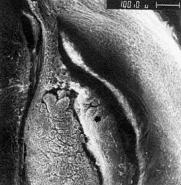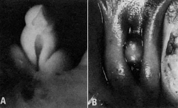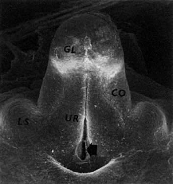 Indifferent Stage The external genitalia originate from mesenchyme located around the cloaca (the anal portion of the hindgut and the primitive urogenital sinus), enclosed by the cloacal membrane. The cloacal area is elevated and represents the genital tubercle of classic embryology. The cloacal membrane is sagittally oriented, is anchored anteriorly to a small glandar tubercle, and is delineated laterally by cloacal folds, ending posterolaterally as anal hillocks (Fig. 20). As the glandar primordium of the phallus develops, the anterior portion of the cloacal membrane provides a sagittally oriented epithelial plate (plug), and the corporal portion of the cloacal membrane is transformed into a depressed urethral groove between the cloacal folds. The rectum becomes separated from the urogenital sinus by a peritoneal fold known as the urorectal septum. Consequently, the cloacal membrane becomes divided by the primitive perineum into the genital membrane anteriorly and the anal membrane posteriorly. The genital membrane disintegrates in 18- to 20-mm embryos (8 weeks after conception). The anal membrane ruptures in 20- to 22-mm embryos. The derivative of the genital tubercle anterior to the opening of the urogenital sinus is properly known as the phallus. Mesenchyme located dorsolateral to the urethral groove contributes the cavernous bodies, and mesenchyme in the urethral folds becomes the spongy body of the urethra. Labioscrotal swellings are cutaneous lobes lateral to the genital tubercle (Fig. 21). The caudal ligaments of the urogenital ridges (testicular gubernaculum in males, round ligament of uterus in females) are anchored in their mesenchyme. Masculinization Masculinization of the external genitalia consists of the transformation of the phallus and labioscrotal swellings, respectively, into the penis and scrotum. During the masculinizing process, the urogenital distance increases and the labioscrotal swellings become interposed between the anus and the opening of the urogenital sinus. The labioscrotal swellings then fuse posteroanteriorly into the scrotum in a zipperlike fashion as the scrotal raphe is formed (Fig. 22). As the rims of the urethral groove fuse (posteroanteriorly), the cavernous urethra is contributed by the urethral folds. The tip of the cloacal membrane, preserved on the glandar primordium for a considerable time as the epithelial plug, becomes luminized by the dehiscence of the epithelium. This process is related to the formation of the preputial lamella, frenulum, and navicular fossa. Masculinization is a dihydrotestosterone-dependent process taking place in 35- to 90-mm fetuses during weeks 9 to 12 after conception. Male accessory organs, such as the prostate and the bulbourethral glands, originate from endodermal buds of the urogenital sinus growing into a specific urogenital mesenchyme. Feminization Feminization of the external genitalia consists of the conversion of indifferent genitalia with a phallus and labioscrotal swellings into a female vulva with a clitoris, labia minora, labia majora, and vaginal vestibule (Fig. 23). In contrast to masculinization, during the feminizing process there is no increase in the anogenital distance and no fusion of the labioscrotal swellings, nor of the rims of the urethral groove. The phallus bends ventrally, and its growth is slow. A sagittal lengthening transforms the urogenital sinus into the vaginal vestibule, and the vaginal and urethral openings become separated. The derivative of the genital tubercle located above the separated urethral and vaginal openings is the clitoris. The rims of the urethral groove become the labia minora, the labioscrotal swellings the labia majora. Feminization of the external genitalia results from the absence of androgens or from androgen insensitivity related to various disorders of the androgen receptor. Female accessory sex glands, such as the glandulae vestibulares majores (Bartholin's glands), minores, and urethrales, originate from endodermal buds growing from the epithelium of the urogenital sinus into adjacent mesenchyme. Similarities in the development of male and female genital organs are evident from Table 2. TABLE 2. Homologues in Male and Female Genital Systems