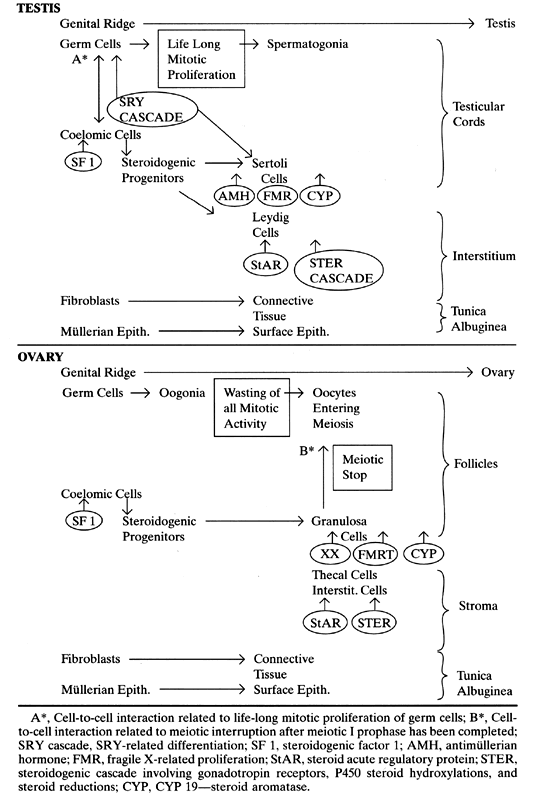 Sex differentiation is under strict genetic control. The basic difference between human males and females affecting every cell is the characteristic chromosomal combination: 46 chromosomes, including X and Y (46,XY), are essential for male cells and 46 chromosomes, with two Xs, for female cells. The difference originates from fertilization. In males, the oocyte is fertilized by a spermatozoon bearing the Y chromosome, in females, by a spermatozoon bearing the X chromosome. The oocytes always contain an X chromosome. Y chromosomes are smaller than X chromosomes and contain fewer genes. The genetic inequality of X and Y chromosomes is compensated, if two X chromosomes are present within the cell nucleus, by heteropycnotic inactivation of much of one of the X chromosomes. Within the interphase nuclei, the inactivated chromatin forms the X chromatin (Barr body). In normal 46,XX cells the inactivation is a random process affecting the paternally derived X chromosomes in 50% of cells and the maternally derived X chromosome in the rest. As the inactivation occurs at the stage of the blastocyst, it seems that sex differences are expressed early and that 46,XY blastomeres divide faster than 46,XX blastomeres.1 If more than two X chromosomes are present in the cell nucleus, the number of X chromatin bodies corresponds to the number of X chromosomes minus one. A small distal portion of the heteropycnotic X chromosome escapes inactivation. This portion represents the pseudoautosomal segment of the X chromosome, which contains 2.5 megabases, homologous to the pseudosomal segment located on the distal portion of the short arm of the Y chromosome. During meiosis, the pseudoautosomal segment of the X and Y chromosomes pair and form chiasmata, permitting gene exchange. Regarding sexual differentiation, the normal Y chromosome contains the sex reversal Y (SRY) gene, or testis-determining factor, which triggers testicular differentiation.2,3,4 The SRY gene is located on the short arm of chromosome Y in a subterminal region (Yp 21) and contains a domain of 80 amino acids (HMG box) that binds to DNA. The SRY gene activates a chain of other downstream genes related to the testicular morphogenic cascade. Although the SRY gene might be a mitotic regulator, it is not directly involved in testicular differentiation. Testicular development is possible in the absence of SRY in some 46,XX males and some true hermaphrodites. The presence of the Y chromosome in interphase cell nuclei is manifested by the presence of Y chromatin. Y chromatin is a strongly fluorescent small chromatin cluster derived from the long arm of the Y chromosome. Its presence does not prove the presence of SRY. |