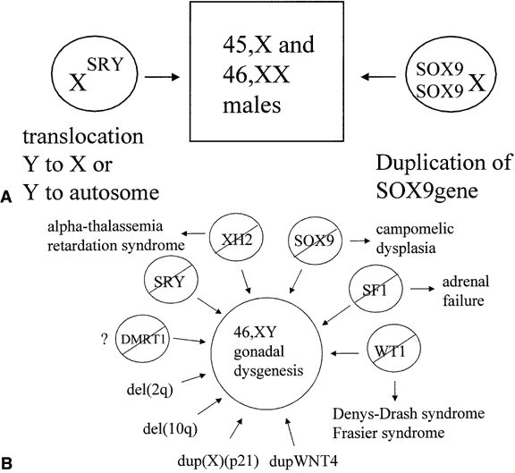 The observation of dimorphic sex chromosomes in 1905 led to the idea that a gene on the Y chromosome was testis determining.18 In humans, this was not confirmed until methods for cytogenetic analysis improved in the 1950s. In that era, the presence of a Y chromosome was shown to be male sex-determining, regardless of the number of X chromosomes present, and the absence of a Y chromosome was shown to be female sex-determining.19,20 Amid these observations, a number of individuals were observed who had genetic sex reversal, genetic sex of one type and a phenotypic sex of the opposite type. These individuals were classified either as 46,XX males or 46,XY females with gonadal dysgenesis; the latter occurred because their gonads regressed after an initial period of differentiation. A model for explaining genetic sex reversal was proposed in 1965 in which nonhomologous recombination between X and Y chromosomes translocated the testis-determining factor from the Y onto the X chromosome.21 This hypothesis was proved correct for many cases of 46,XX maleness and was instrumental for the cloning of the Y-linked testis-determining factor (Fig. 2A). Still, not all cases of sex reversal could be explained by this observation, and the study of individuals with other forms of genetic sex reversal has been important for identifying autosomal- and X-linked sex-determining genes (see Fig. 2B).