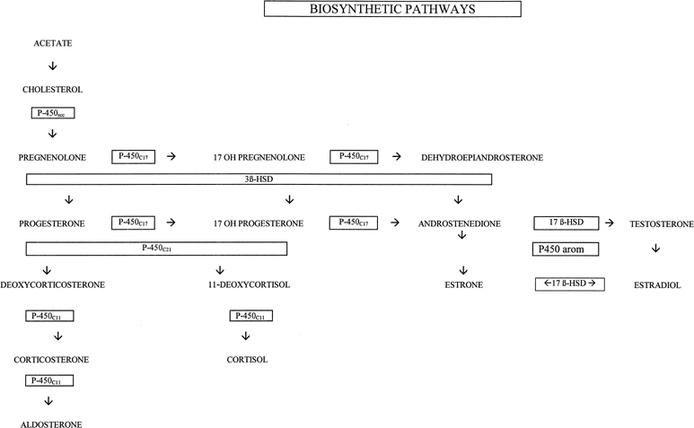 Recent advances in molecular genetics have greatly expanded our understanding of these disorders. Deficiencies of steroidogenetic enzymes may result from three types of genetic aberrations: point mutations, gene deletions or insertions, and gene conversions. Point mutations (single-base changes) are the most common type of gene conversion. Congenital Adrenal Lipoid Hyperplasia Prader and Gurtner8 described a group of infants with severe adrenal insufficiency and massive amounts of cholesterol deposited in the adrenal cortex and gonads in 1955. Patients with a deficiency of cholesterol side-chain cleavage enzyme (P-450scc) lack the ability to metabolize cholesterol in the adrenals and develop large, yellow, foamy adrenal glands. The enzyme P-450sec initiates the steroidogenic pathway cleaving a 6-carbon side chain from cholesterol to produce pregnenolone. This rate-limiting step is regulated by ACTH, angiotensin II in the adrenal glands, and by gonadotropins in the gonads. Abnormalities of this enzyme are extremely rare and usually incompatible with life. CYP11A is the gene that encodes for cytochrome P-450scc It has been cloned and localized to the long arm of chromosome 15, it is 20 kb long, and consists of 9 exons.9 In rabbits, homozygous CYP11A1 deletion adrenal lipoid hyperplasia consistently occurs. However, abnormalities in the CYP11A gene have never been observed in humans with congenital adrenal lipoid hyperplasia.10 The disorder in humans appears to be the result of perturbations of the gene encoding, steroidogenic acute regulatory protein (StAR). The StAR protein is responsible for delivery of precursors for cholesterol side chain cleavage. The term acute in the name refers to the rapid response to corticotropin stimulation to produce a 30-kd mitochondrial protein in adrenal cells. The StAR gene is 8-kb long and consists of 7 exons and has been mapped to 8P11.2.11 A variety of mutations have been reported.12 Approximately 100 cases have been reported and reflect preponderance among Japanese and Koreans. At least 15 different mutations have been reported. Eighty percent of affected Koreans and Japanese have the same mutant allele, Gln 258 (stop). Arg 182 Leu affects 78% of Arabs reported to have congenital adrenal lipoid hyperplasia.10 Adrenal insufficiency with low levels of cortisol, aldosterone, and androgens is the principal manifestation. Hyperpigmentation and respiratory distress occur in 25% of affected neonates. They present with failure to thrive, lethargy, vomiting, diarrhea, hypernatremia, hypokalemia, and hypertension. ACTH levels and plasma renin activity are elevated. Genetic males present with ambiguous or female external genital. Affected females have normal genitalia. All surviving infants have been assigned female gender identities. Successful treatment can be accomplished with glucocorticoids and mineralocorticoid replacement. Prophylactic orchiectomy should be performed on affected males, and all patients may benefit from estrogen therapy to initiate pubertal development at the appropriate time. 3-β-Hydroxysteroid Dehydrogenase Deficiency Bongiovanni13 initially described this syndrome in 1962 as a variant of the adrenogenital syndrome (coincident adrenal disease and abnormal genital development). The syndrome results from a block in the conversion from the Δ5 to Δ4 pathways (see 3-β-HSD in Fig. 1). Previously, two enzymes, 3-β-hydroxysteroid dehydrogenase and Δ5,Δ4 isomerase were thought to be required for this reaction, but a single 45-kb protein has been identified with both dehydrogenase and isomerase activities which are inseparable.14 Moreover, 3-β-hydroxysteroid dehydrogenase is the only steroidogenic enzyme leading to the production of cortisol that does not depend on cytochrome P-450; it requires the cofactor nicotinamide-adenine dionucleotide oxidized (NAD+) and is a microsomal enzyme. Human 3-β-hydroxysteroid dehydrogenase (both types I and II) has two isoenzymes and corresponding messenger RNA. These genes have been localized to the long arm of chromosome 1 in the P11–13 band15,16 and both have four exons. Type II is expressed in gonads and adrenals. Mutations that produce both virilization and salt wasting have essentially abolished enzyme activity; mutations associated only with virilization are missense mutations with 1% to 10% of normal enzyme activity.17 The mutations producing the two phenotypes are scattered among all of the exons. Two forms of 3-β-hydroxysteroid dehydrogenase deficiencies have been described. The classic, as originally described by Bongiovanni, is associated with complete block of 3-β-hydroxysteroid dehydrogenase activity, and nonclassic, is a partial deficiency. Patients with classic, 3-β-hydroxysteroid dehydrogenase deficiency present in infancy with severe sodium wasting and the outcome is fatal if early intervention is not undertaken. The adrenals and gonads are affected with resulting deficient production of glucocorticoids, mineralocorticoids, and sex steroids. Cortisol deficiency results in ACTH stimulation and congenital adrenal hyperplasia. Production of both androgens and estrogens are impaired and the major androgen produced is DHEA, which is responsible for incomplete virilization in males and partial virilization in females. Thus, 3-β-hydroxysteroid dehydrogenase is the only enzyme deficiency associated with both male and female pseudohermaphroditism. Diagnosis is established with elevated pregnenolone, DHEA, and ratios of Δ5/Δ4 steroids. In males, testes are usually palpable, with various degrees of hypospadias or incomplete pseudovagina hypospadias. Females may have clitoral enlargement and partial or complete labial fusion. The nonclassic form of 3-β-hydroxysteroid dehydrogenase deficiency is associated with a partial deficiency and represents a less severe clinical presentation and is much more common than the classic presentation. The typical presentation of the nonclassic form is either