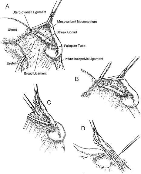45,X/46,XY individuals have a 45,X cell line and at least one cell line containing a Y chromosome. Based on cohort studies of 45,X/46,XY cases detected in utero(prenatal genetic diagnosis), more than 90% of cases are normal males.6 The phenotype of cases ascertained postnatally differs markedly, doubtless reflecting selection basis. Postnatal cases manifest a variety of phenotypes but predominately genital ambiguity or phenotypically normal females.7,8,9 Different phenotypes presumably reflect different tissue distributions of the various cell lines. Of note, structurally abnormal Y chromosomes are not infrequently present. Given that structurally abnormal chromosomes (e.g., dicentric) are often unstable, it is likely that the 45,X line arises secondarily after loss of the structurally abnormal Y. This may explain why certain infertile males with normal external genitalia, for example requiring intracytoplasmic sperm injection (ICSI), may have offspring with genital ambiguity. In the sons a 45,X line might have arisen secondarily. 45,X/46,XY with Unambiguous Female External Genitalia These 45,X/46,XY individuals may have Turner’s stigmata and be clinically indistinguishable from 45,X individuals in many ways. However, 45,X/46,XY cases may be normal in stature and show no somatic anomalies. External genitalia, vagina, and müllerian derivatives remain unstimulated because of the lack of sex steroids. Breasts fail to develop, and little pubic or axillary hair develops. If breast development occurs in a 45,X/46,XY individual, an estrogen-secreting tumor such as gonadoblastoma or dysgerminoma should be suspected.10 However, virilization has also been claimed to result from gonadotropin stimulation of streak gonads11; studies of such cases would be welcome. Although streak gonads of 45,X/46,XY individuals may be histologically indistinguishable from streak gonads of 45,X individuals, gonadoblastomas or dysgerminomas develop in approximately 15% to 20% of 45,X/46,XY individuals.12 If retained in a phenotypic XY female, presence of the Yq locus GBY (gonadoblastoma Y chromosome) is believed to predispose to neoplasia. If GBY is deleted, as it is in many deletions of Yq, risk of neoplasia is diminished in gender-reversal females.13 Neoplasia may develop in the first or second decade of life. Even if the presumptive GBY locus were absent, we recommend gonadal extirpation for all 45,X/46,XY individuals having female external genitalia. The uterus should be retained, given that pregnancy may be achievable through donor oocytes or donor embryos. Gonadectomy can usually be accomplished by laparoscopy14 (Fig. 1). Although preferable to removing only gonads, adnexal removal may technically be necessary as well. Only rarely should laparotomy prove necessary. 45,X/46,XY with Ambiguous External Genitalia The term asymmetric or mixed gonadal dysgenesis applies to individuals with one streak gonad and one dysgenetic testis. These individuals usually have ambiguous external genitalia and a 45,X/46,XY complement, and usually a uterus. Many investigators believe that the phenotype is invariably associated with 45,X/46,XY mosaicism. Occasionally only 45,X or only 46,XY cells are demonstrable. Ostensibly, nonmosaic cases may merely reflect inability to sample sufficient tissues or cells. 45,X/46,XY individuals with ambiguous external genitalia usually have müllerian derivatives (e.g., a uterus). Presence of a uterus is important diagnostically because that organ is absent in almost all genetic (mendelian) forms of male pseudohermaphroditism. If an individual shows ambiguous external genitalia, bilateral testes, and a uterus, it is reasonable to infer 45,X/46,XY mosaicism actually exists. This statement still applies if both lines cannot be demonstrated cytogenetically. Occasionally the uterus may be rudimentary, or a fallopian tube may fail to develop ipsilateral to a testis. 45,X/46,XY with Nearly Normal Male External Genitalia 45,X/46,XY mosaicism may be detected in individuals with nearly normal male external genitalia. In fact, this is the most common 45,X/46,XY phenotype based on liveborn follow-up of 45,X/46,XY fetuses ascertained at amniocentesis, 90% of whom show a normal male phenotype.15 That 45,X/46,XY neonates far more commonly show genital ambiguity merely reflects biases of ascertainment. Those with male phenotype pass unrecognized. 45,X/46,XY individuals having almost normal male external genitalia do not seem to develop neoplasia as often as 45,X/46,XY individuals having female or frankly ambiguous genitalia.16 If gonads can be assessed periodically within the scrotum by ultrasound or palpation, gonadal extirpation should not be necessary if the male gender of rearing is chosen. |