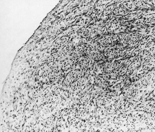 Cytologic Origin In 80% of 45,X cases the X is maternal (Xm) in origin. In the remaining 20% the remaining X is paternal (Xp) in origin.9,10 Monosomy X GONADS. In monosomy X the gonad usually exists not as the typical ovoid structure but as a white fibrosis streak, 2 to 3 cm long and approximately 0.5 cm wide, located in the position ordinarily occupied by the ovary (Fig. 1). A streak gonad is characterized histologically by interfacing waves of dense fibrosis stroma (Fig. 2).