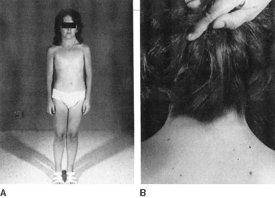 That 45,X individuals show streak gonads as adults is not as obvious as might be expected, given that relatively normal ovarian development occurs in many other mammals (e.g., mice) with monosomy X. The presumptive explanation is that pivotal genes on the normal heterochromatic (inactive) X are being inactivated. Of the some 2000 genes on the X, only perhaps 5% escape inactivation.11 Most of these genes are on the X short arm (Xp), clustered in selected euchromatic regions. Candidate genes for ovarian maintenance genes will probably prove to lie in these euchromatic regions. The endocrinologic correlates of ovarian failure are deficient secretion of sex steroids. Estrogen and androgen levels are thus decreased; follicle-stimulating hormone (FSH) and luteinizing hormone (LH) levels are compensatively increased. Deficiencies of estrogen-dependent processes leads to predictable effects of hormonal deficiency. Premenarchal uterine enlargement and growth spurt are not observed. Pubic and axillary hair fail to develop at puberty (Fig. 3). Breasts contain little parenchymal tissue, and areolar tissue is only slightly darker than the surrounding skin. External genitalia, vagina, and müllerian derivates are well differentiated, but remain small (unstimulated) in the absence of exogenous steroids. Approximately 3% to 5% of adult 45,X patients menstruate spontaneously (at least twice) and show breast development. Many fertile patients have been reported, as recently reviewed by Abir and colleagues12 and Hovatta.13 An undetected 46,XX cell line (i.e., 45,X/46,XX mosaicism) should be suspected in menstruating 45,X patients. This is especially plausible in reports like that of Magee and colleagues14 who observed seven pregnancies in one ostensibly 45,X woman. However, it is not expected that some 45,X individuals could be fertile, inasmuch as germ cells are present in 45,X embryos. In addition, pregnancy can occasionally be achieved in hypergonadotropic women by sequential gonadotropin suppression followed by ovulation induction. Check and colleagues15 induced ovulation in 5% of 361 cycles in 100 hypergonadotropic women; the chromosomal complements of women were not stated. Hormonal treatment of 45,X women usually involves hormone therapy (estrogen and cyclic progestogens). This can result in normal uterine size, which could be followed by assisted reproductive technology (ART) if pregnancy is desired. The process involves a partner’s sperm being mixed with ova donated from another woman, fertilization in vitro, and transfer of embryo to the uterus of the hormonally synchronized 45,X patient. The success rate (clinical pregnancies) is over 20% per cycle. Thus, Foudila and colleagues16 reported 20 clinical pregnancies among 18 women with Turner’s syndrome, the exact chromosomal complements not being stated. Although the clinical pregnancy rate per fresh embryo transferred was impressive at 46% (13/28), 7 of the 13 (54%) resulted in spontaneous abortion, for a take-home baby rate of 46% (6/13). Among transferred frozen embryos the rates were 28% (7/25) and 14% (1/7), respectively. Low pregnancy rates were also reported by Khastgir and colleagues17 and Tarani and colleagues.18 The ability of a 45,X woman to carry her pregnancy to term must be addressed before embarking on ART. Specifically, women with coaratation of the aorta may be unsuitable candidates. The increased prevalence of autoimmune disease (e.g., thyroiditis), carbohydrate dysfunction (diabetes mellitus), hypertension, and other adult-onset diseases further places many 45,X patients in high-risk situations. In the opinion of the author, offspring of 45,X women show little, if any, increased risk for chromosomal abnormalities.19,20 Claims to the contrary12 need to be tempered by biases of biases of ascertainment not being taken into account. Outcomes are relatively normal in pregnancies observed after the index case was diagnosed (truncate analysis). Adverse outcomes prior to that time were probably the reason cytogenetic studies were initiated. Spontaneous abortions are increased donor oocyte ART. This probably reflects hormonal dysfunction or uterine factors (hypoplasia), rather than transmission of aneuploid (monosomic) gametes. Somatic Anomalies 45,X individuals not only are short (less than 4 feet 10 inches) but often exhibit various somatic anomalies (Turner stigmata) (Table 1). No single feature(s) of Turner stigmata is pathognomonic, but in aggregate a characteristic spectrum exists that is more likely to exist in 45,X individuals than in individuals having most other sex chromosomal abnormalities. Systematic evaluation of renal, vertebral, cardiac, and auditory function is obligatory, irrespective of the patient’s age when diagnosed. Growth 45,X neonates are usually low birth weight. Total body length at birth is less than normal, but often close to the 50th percentile. Before puberty, height velocity falls in the 10th to 15th percentile,21 and the mean height of untreated 45,X adults (younger than 16 years old) is between 141 and 146 cm,22,23 perhaps 20 cm less than normal. In normal females the predicted adult height can be estimated by summing the heights of both parents, dividing by 2, and subtracting by 13 cm.24 Taking into account decreased expected height for 45,X individuals, correlation of the height of a 45,X offspring with midparental height holds for Turner syndrome as it does for normal 46,XX females.25 That is, absolute height predicted in Turner syndrome is less but the midparental height correlation still holds. Various treatments for short stature in 45,X patients have proposed, including growth hormone (GH), anabolic steroids and low-dose estrogen.26 Most treatment regimens show ostensible benefit, especially immediately after onset of therapy. Consensus is now that that ultimate height can be increased by 6 to 8 cm by GH treatment alone.27,28 The most popular form of treatment is human recombinant DNA-derived