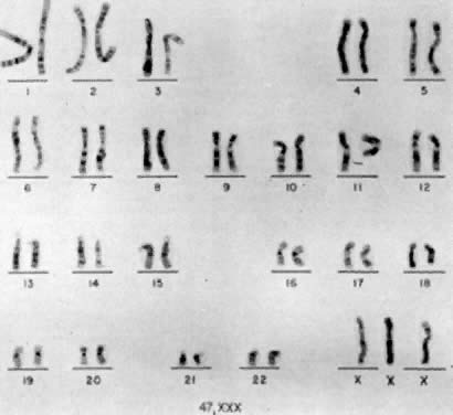CELLULAR ETIOLOGY. 47,XXX can be the result of a nondisjunction of the two X chromosomes during meiosis I of the primary oocyte. It can also be the result of X chromatid nondisjunction during meiosis II, either of the secondary oocyte or of the secondary spermatocyte carrying an X chromosome. 48,XXXX and 49,XXXXX are due to double nondisjunction of the female germ cell. A 48,XXXX could originate from sequential nondisjunction of (1) the oogonial XX bivalents during meiosis I and (2) chromatids of one X chromosome during meiosis II, resulting in a 25,XXX ovum and, after fertilization with an X-carrying sperm, in a 48,XXXX zygote. The mechanism leading to 49,XXXXX is somewhat similar, except that chromatid nondisjunction of both X chromosomes during meiosis II has to take place to produce an ovum with four X chromosomes. The origin of the extra X chromosome in 47,XXX patients is usually nondisjunction occurring during maternal meiosis I. Study of Xg blood group* alleles provided initial data concerning origin of the extra X chromosome56; however, Morton and associates57 found the Xg locus to be virtually uninformative about the origin of the extra X chromosome in 47,XXX women because of the long distance between the Xg locus and the centromere. This long distance makes distinction between meiosis I and meiosis II unreliable; as the distance between a gene locus and centromere increases, the chance of crossing-over between the two increases, leading to potential diagnostic discrepancies. More recently, May and colleagues58 used X-linked DNA polymorphisms, located relatively close to the X chromosome centromere, to study parental origin of the extra X chromosome in 28 47,XXX women. Maternal nondisjunction accounted for the extra X chromosome in 26 of the 28 women; of these 26 women, the extra X chromosome was definitely shown to be an error at meiosis I in 15 women, and to an error at meiosis II in 6 women. In the remaining 5 women, the origin of the extra maternal X chromosome could not be determined. In addition, this study revealed an association between advanced maternal age and 47,XXX offspring59 resulting from errors at maternal meiosis I but failed to reveal an association between advanced maternal age and nondisjunction occurring at maternal meiosis II. This may explain findings of Barr and colleagues,55 who found advanced maternal age to be associated with 47,XXX offspring but not as strongly as is seen in autosomal trisomies involving acrocentric chromosomes. CLINICAL FINDINGS. Several studies have suggested that there is an increased likelihood that 47,XXX women will exhibit developmental delay or mental illness. The magnitude of the increased risk is difficult to estimate because most 47,XXX patients have been ascertained in surveys of the mentally retarded. However, the prevalence of 47,XXX is higher among the mentally retarded than among consecutively born neonates; these observations support the apparent relationship between mental retardation and 47,XXX. Tennes and colleagues60 are prospectively studying 11 females whose 47,XXX was identified at birth. About a third have shown delayed motor and speech development. Robinson28 summarized the clinical findings from 49 children with 47,XXX complements who were studied prospectively at six different medical centers. Nineteen of 41 children studied showed delays in both receptive and expressive language development. Full-scale IQ levels were significantly lower than for siblings and controls. Five of 34 probands had IQ levels below 70. Salbenblatt and co-workers61 found 47,XXX women to exhibit both gross and fine motor dysfunction as well as abnormal sensory-motor integration. These difficulties resulted in language delays that inevitably led to poor classroom performance. In addition, 47,XXX children exhibited a delay in the age of independent walking, thereby confirming the consistency of motor dysfunction throughout development. These data must be considered as tentative because of the spectrum of ages among probands, siblings, and controls and the variety of tests used. In addition to neurologic deficits, 47,XXX individuals exhibit dermatoglyphic abnormalities; however, it is difficult to determine whether 47,XXX individuals exhibit other somatic abnormalities more often than expected by chance. Dermatoglyphic abnormalities include decreased mean digital ridge count, increased radial loops and arches, absence of patterns in the first and second interdigital areas, wide ridges in the a-b interval, and complex patterns of the soles.62 It has been estimated that about 20% of 47,XXX women may experience delayed menarche, premature ovarian failure, and underdevelopment of secondary sexual characteristics.63,64,65 Varrela and Alvesalo66 have demonstrated taurodontism in four 47,XXX women. In addition, Lenoble and Kaplan67 described a 47,XXX woman who developed systemic lupus erythematosus (SLE), remarkable for numerous visceral localizations, multiple antinuclear antibodies, and high serum levels of IgG and IgA. However, the majority of 47,XXX individuals are normal and may be fertile. GENETIC COUNSELING. Theoretically, one would expect that 47,XXX women would have a 50% risk of having aneuploid offspring (i.e., 25% 46,XX; 25% 46,XY; 25% 47,XXX; 25% 47,XXY); however, most progeny are chromosomally normal. These empiric observations may reflect (1) selection against abnormal embryos, (2) preferential segregation of 24,XX into a polar body, or (3) decreased fertilizability of 24,XX oocytes. Nonetheless, various reports have suggested that 47,XXX and 46,XX/47,XXX women show some increased risk of producing chromosomally abnormal offspring. For example, in 1969, Barr and co-workers tabulated that 1 of 20 reported 47,XXX women had a 47,XXY son; 3 of 8 46,XX/47,XXX women had 47,XXY or 46,XY/47,XXY sons; and 1 of the 8 had a 46,XX/47,XXX daughter. Although controversial, there is also a suggestion that maternal trisomy X may affect the disj