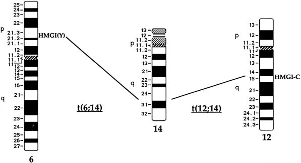 increased tumor size with presence or type of chromosomal abnormalities.10,13,14 Clonality Studies of Uterine Leiomyomas Cytogenetic analyses of multiple fibroids from a single uterus have demonstrated that the tumors can harbor different chromosomal changes, suggesting that each fibroid develops independently. X-inactivation studies, which exploit the phenomenon of Lyonization, have clearly demonstrated that fibroids develop as clonal lesions.15,16,17,18 Initially, X-linked glucose-6-phosphate dehydrogenase (G6PD) isoenzyme analysis was used to demonstrate the independent clonal origin of multiple tumors within a single uterus.17,18 However, a low degree of G6PD isoenzyme polymorphism among most females across various ethnic groups limited the usefulness of this analysis. Another approach, based on the CAG repeat polymorphism in the X-linked androgen receptor gene, was used in a more recent study to examine clonality.15 Experiments in this study demonstrated a random pattern of inactivation among multiple tumors: individual tumors exclusively expressed one or the other allele, confirming the hypothesis that multiple tumors within a single uterus arise independently. Another study, using DNA digestion with methylation-sensitive restriction enzymes to examine differences in methylation between the active and inactive X chromosome at the androgen receptor locus, confirmed the monoclonal nature of fibroids.19 It is possible, however, that some leiomyomas develop from a common precursor cell; the discovery of identical cytogenetic abnormalities in multiple fibroids from the same patient argues for this path of development.10 Yet these changes may simply be representative of neoplastic smooth muscle. A study of a single patient with two independent fibroids, each showing different patterns of X-chromosome inactivation but identical del(7)(q21.2q31.2) derivative chromosomes, certainly supports this latter hypothesis.20 Studies of tumors that initially appeared to be polyclonal have shown that two independent fibroids can actually develop in extremely close proximity to each other.21 The discovery of heterogeneity of chromosomal aberrations is consistent with the multistep hypothesis of tumor development, in which the function (or dysfunction) of several genes at multiple loci results in fibroid growth. Abnormalities at several loci have been documented in individual tumors, and this heterogeneity may explain clinicopathologic differences seen in fibroids, including variation in size or response to hormonal treatments. With such heterogeneity it is possible that, rather than a required order to the mutation of critical genes, the combined action of individual genes and accumulation of mutated loci contribute to the growth of leiomyomas. This phenomenon has been studied and described in detail for a number of malignant tumors.22,23 The t(12;14) Subgroup Approximately 20% of karyotypically abnormal leiomyomas show a characteristic t(12;14) rearrangement, the most commonly seen chromosomal translocation in fibroids as well as the first cytogenetic anomaly to be associated specifically with uterine leiomyomas.24 The finding of rearrangements involving the same region of 12q in other mesenchymal solid tumors (e.g., angiomyxomas, breast fibroadenomas, endometrial polyps, hemangiopericytomas, lipomas, pulmonary chondroid hamartomas, salivary gland adenomas) supported the notion that a critical gene(s) for the process of tumorigenesis mapped to 12q14–15 (Fig. 1).25,26,27,28,29,30,31,32,33 The fact that t(12;14) was frequently the sole detectable chromosomal alteration in a subset of fibroids lent additional support to the importance of genes mapping to the breakpoints involved in this translocation. After many efforts to map the critical region on chromosome 12, a single yeast artificial chromosome (YAC) clone was found to span cytogenetic breakpoints in uterine leiomyoma, pulmonary chondroid hamartoma, and lipoma specimens with t(12;14) translocations, and therefore was likely to include the critical gene.34 The HMGA2 [formerly designated as HMGI(C)] gene was first considered a positional candidate because it mapped within this YAC clone and eventually was identified as the disrupted gene in a series of mesenchymal tumors.34,35 A candidate gene on chromosome 14 that may be involved in t(12;14) is RAD51L1, which was recently identified as a partner of HMGA2.36,37RAD51L1 is a member of the recA/RAD51 recombination repair gene family. However, it is important to note that RAD51L1 spans a large genomic region of approximately 700 kilobits that potentially contains multiple other genes that may play a role in the pathobiology of fibroids.
